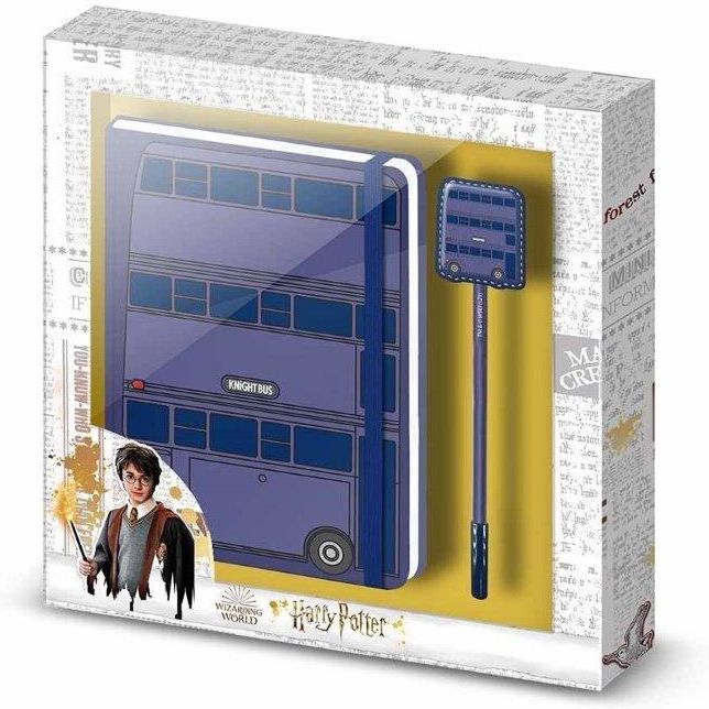zestaw licencyjny Harry Potterzapakowany w prezentowe tekturkowe opakowanieskłada się zfioletowego notesu z gumkąz zakładkąw twardej okładce z nadrukiem autobusu londyńskiego oraz długopisu z zatyczką z ozdobną nasadką na górze