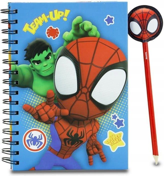zestaw licencyjny Spidey i super-kumple zapakowany w prezentowe tekturkowe opakowanie składa się z niebieskiego notesu ze spiralką w twardej okładce z wizerunkiem Spideya i Hulka oraz czerwonego ołówka z ozdobną nasadką na górze