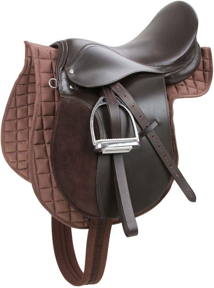 Zestaw odpowiedni dla początkujących, szkółek jeździeckich itp. W skład zestawu wchodzi skórzane siodło z głębokim siedziskiem, idealnym dla początkujących jeźdźców. Poduszki siodła pokryte są zamszową skórą, co pomaga utrzymać prawidłową pozycję nóg. W zestawie znajduje się również czaprak z klasycznym pikowaniem, puśliska ze strzemionami oraz bawełniany popręg. • Rozmiar: haflinger • materiał siodła: skóra • Kolor: brązowy • Rozmiar siedziska: 17,5" • Szerokość przedniego łęku: 34,5 cm • Długość popręgu: 125 cm