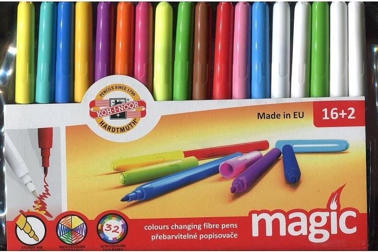 czarodziejskie flamastry Magic zestaw 16 kolorów i 2 flamastery bezbarwne, którymi można zmienić kolory obrazka wykonanego flamastrami Magic; można w ten sposób podwoić gamę kolorów zestawu: 16 + Magic Pen = 32 umożliwia to wykonywanie niepowtarzalnych efektów np.bliskość dwóch kolorów obok siebie bez nieporządanego efektu nachodzenia na siebie, przerywane i kolorowe linie całkowicie bezpieczne dla użytkownika opakowanie: etui foliowe