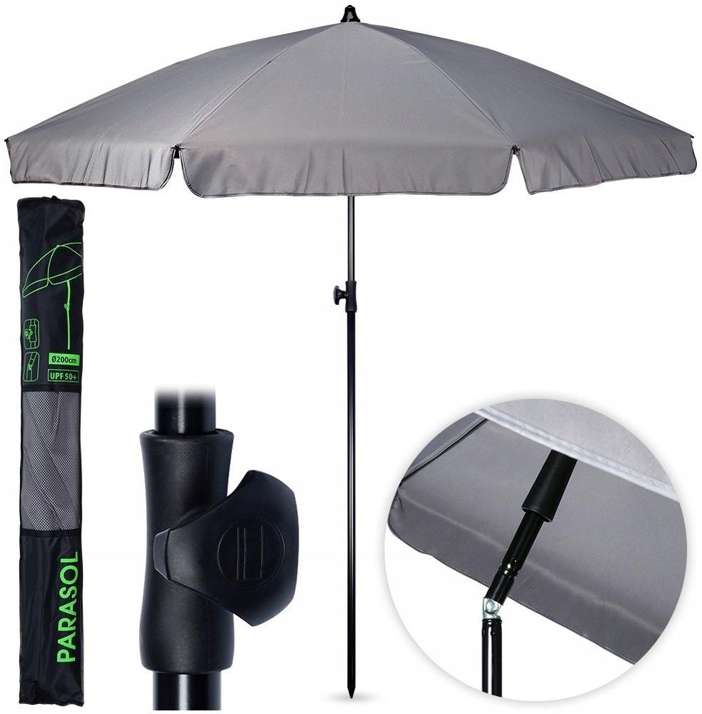 Parasol ogrodowy - Solidny parasol ogrodowy o średnicy 185 cm, jego wysokość to 235 cm, średnica rurki wynosi 2,5 cm. Przydatny w okresie letnim. Stabilna konstrukcja - Parasol umocowany jest na stalowej ramie w kolorze czarnym, co zapewni mu stabilność. Czasza wykonana z poliestru w kolorze szarym. Drążek parasola można bardzo łatwo wbić w ziemię na plaży, w ogrodzie lub na pikniku. Ochrona przed słońcem - Skutecznie ochroni nas przed promieniowaniem słonecznym i zapewni cień. Posiada ochronę UPF 50+. Regulowany kąt nachylenia - Parasol posiada możliwość regulacji kąta nachylenia, co pozwala dostosować go do kierunku padania słońca i zapewnia optymalną ochronę. Uniwersalne zastosowanie - Parasol wykorzystamy zarówno w ogrodzie, jak i na działce, plaży. Możemy zabrać go ze sobą na biwak lub wędkowanie. Ochroni przed słońcem na balkonie, tarasie. Będzie stanowił element ozdobny. Parasol ogrodowy z regulowanym kątem nachylenia. Utrzymany w modnej kolorystce, będzie stanowił ochronę przed słońcem, ale również element dekoracyjny w ogrodzie, na balkonie, tarasie czy na działce. Podczas deszczu zaleca się złożenie parasola. Dzięki stalowej ramie, parasol jest stabilny. Wyprodukowano zgodnie z europejskimi standardami.