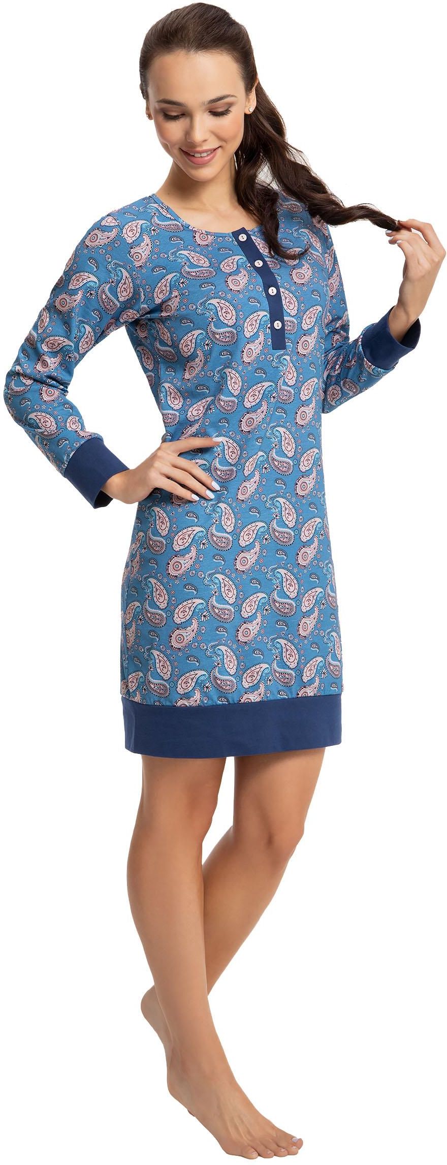 Wygodna koszula damska polskiej marki LUNA, wykonana z dzianiny we wzór paisley, w modnym zestawieniu kolorystycznym. Dekolt półokrągły z zapięciem typu polo na 4 guziki. Rękawy długie, wykończone ściągaczem. Dół koszuli wykończony również praktycznym jednobarwnym ściągaczem. Długość około kolan. Ta bawełniana koszula damska sprawdzi się zarówno w domu jak i na wyjazdach. Delikatna dla ciała i przewiewna, zapewni spokojny sen. Skład surowcowy: 100% bawełna Kolor: niebieski, wielokolorowy PRODUKT POLSKI
