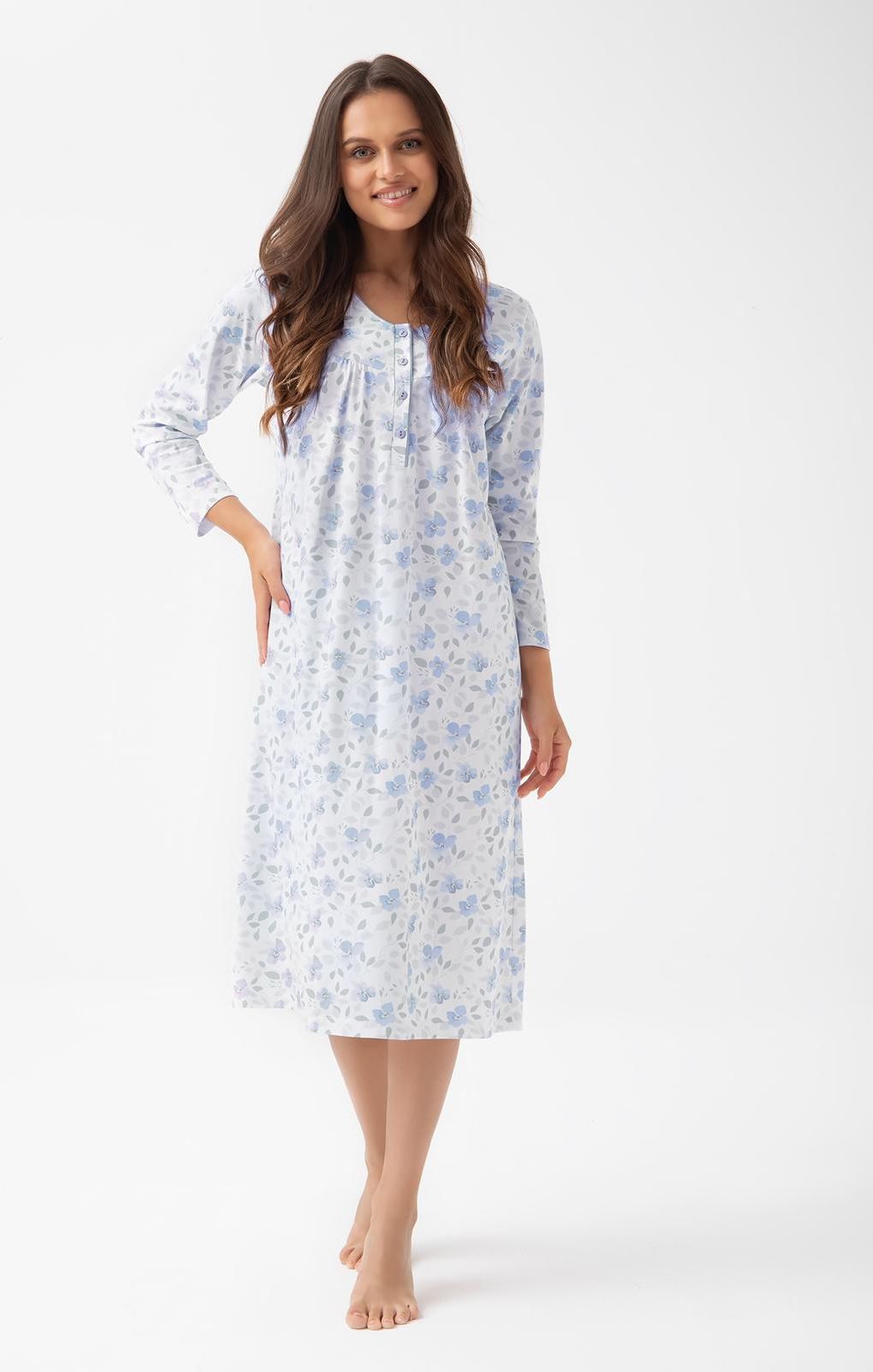 Koszula damskaw niebiesko-szare kwiatki i listki to praktyczne rozwiązanie, które sprawdzi się w szafie każdej kobiety. Ten model o luźniejszym kroju cieszy się dużym powodzeniem wśród pań. Pod karczkiem koszulka posiada marszczenie, zapewniające swobodę ruchów i komfort spania. Koszula posiada dekolt w lekko zaokrąglony serek, karczek, marszczenia oraz zapięcie na cztery guziki. Dekolt i zapięcie ozdobione zostały różową wypustką w kolorze wzoru kwiatów i guzików. Rękawy długości 3/4. Długość koszuli za kolana. Wysoka jakość dzianiny i dbałość o wykończenie to dodatkowe atuty koszulki. Koszulę zestawiać można z wieloma szlafrokami z naszej kolekcji. Dzięki wygodnemu krojowi i zapięciu na guziki ta koszula sprawdzi się również u mam karmiących piersią, a także pomieści ciążowy brzuszek. Kolor: biały, niebieski, szary Skład: 100% bawełna