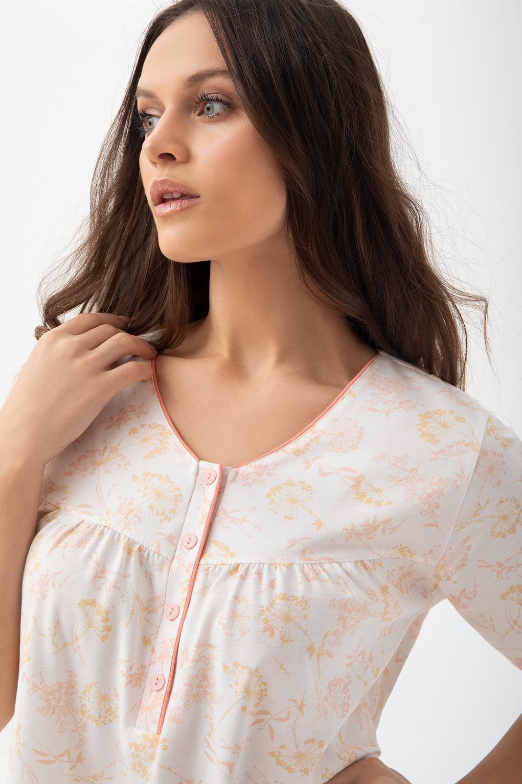 Koszula nocna damska, wykonana z miękkiej, przewiewnej bawełnianej dzianiny, która zapewnia komfort podczas snu. Posiada subtelny nadruk w kopry oraz łososiowe dodatki - guziki i wykończenie przy dekolcie i zapięciu. Klasyczny karczek z marszczeniem dodaje jej uroku i lekkości, a krótkie rękawy zapewniają wygodę ruchów. Koszula posiada praktyczne zapięcie polo na cztery guziki, co ułatwia zakładanie. Sięgająca za kolana, oferuje swobodny, niekrępujący ruchów krój, który sprawdzi się idealnie zarówno podczas snu jak i leniwych poranków. Wysoka jakość bawełnianej dzianiny i dbałość o detale to dodatkowe atuty koszulki. Koszulę zestawiać można z wieloma szlafrokami z naszej kolekcji. Dzięki wygodnemu krojowi i zapięciu na guziki ta koszula sprawdzi się również u mam karmiących piersią, a także pomieści ciążowy brzuszek. Kolor: ekri, łososiowy, miodowy Skład: 100% bawełna