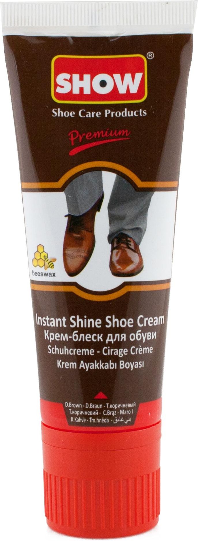 Pasta, krem do butów, samopołyskowy, brązowy, Show, 75 ml. Brązowa pasta samo nabłyszczająca, krem samo połyskowy do butów marki Show 75 ml doskonale pielęgnuje i chroni obuwie ze skór naturalnych i sztucznych przed niszczącym wpływem czynników atmosferycznych. Zaawansowana formuła produktu ( z naturalnych wosków ) nadaje butom piękny połysk i głębszą barwę, zapobiegając zniszczeniom w wyniku codziennego użytkowania. Wygodny aplikator z gąbki umożliwia bardzo wygodne nakładanie pasty.