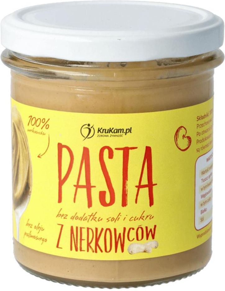 Krukam Masło Z Nerkowców 300G Krukam Masło Z Nerkowców 300G to zdrowa alternatywa dla tradycyjnych past i kremów, która zyskuje coraz większą popularność wśród osób dbających o swoje zdrowie. W dobie rosnącej świadomości żywieniowej, ten produkt wyróżnia się naturalnym składem oraz brakiem szkodliwych dodatków. Dzięki wyjątkowym właściwościom orzechów nerkowca, masło nerkowcowe to nie tylko smakuje wyśmienicie, ale także wspiera zdrowe nawyki żywieniowe. Skład produktu Krukam Masło Z Nerkowców to produkt w 100% naturalny, który nie zawiera dodatku cukru ani oleju palmowego. Orzechy nerkowca, z których powstaje to masło, pochodzą z tropikalnych rejonów Ameryki Południowej, znanych z bogactwa składników odżywczych. Dzięki braku konserwantów i sztucznych dodatków, każdy słoik to esencja zdrowia zamknięta w wygodnym opakowaniu. Wartości odżywcze Masło nerkowcowe to prawdziwa skarbnica wartości odżywczych. W 100 gramach produktu znajdziemy: wartość energetyczna: 2552 kJ / 615 kcal, tłuszcz: 48,9 g (w tym tłuszcze nasycone: 8,8 g), węglowodany: 20,8 g (w tym cukry: 5 g), białko: 21,2 g, sól: 0,01 g. Wysoka zawartość białka oraz zdrowych tłuszczy czyni ten produkt idealnym dodatkiem do diety osób aktywnych, które poszukują źródła energii oraz wsparcia w budowie masy mięśniowej. Regularne spożywanie tego produktu wspiera zdrowie serca oraz poprawia kondycję psychiczną. Zalety produktu Masło nerkowcowe oferuje szereg korzyści, które mogą wpłynąć na codzienne żywienie. Oto kluczowe zalety, które warto wziąć pod uwagę: brak dodatku cukru, brak oleju palmowego, wysoka zawartość białka, korzystny wpływ na układ krążenia, możliwość stosowania w diecie wegańskiej, odpowiednie dla osób na diecie keto-friendly. Dzięki tym cechom, masło nerkowcowe może być cennym elementem zdrowej diety, wspierającym zarówno codzienne nawyki żywieniowe, jak i długoterminowe cele zdrowotne. Certyfikaty i etykiety Krukam Masło Z Nerkowców posiada wiele certyfikatów, które świadczą o jego wysokiej jakości. Produkcja odbywa się w zakładzie, w którym przestrzegane są najwyższe standardy, co gwarantuje, że każdy słoik jest wolny od szkodliwych substancji. Wybierając ten produkt, można być pewnym, że wspiera się lokalne produkcje oraz zdrowe nawyki żywieniowe. Dieta i styl życia Nerkowcowe smarowidło jest doskonałym elementem diety wegańskiej, a także może być włączone do diet bezglutenowych oraz keto-friendly. Dzięki swojemu naturalnemu składowi oraz korzystnym właściwościom, idealnie wpisuje się w potrzeby osób dbających o zdrowe odżywianie. Można je wykorzystać jako smarowidło do pieczywa, dodatek do smoothie, a także jako składnik w zdrowych deserach. Pojemność produktu Każde opakowanie Krukam Masło Z Nerkowców ma pojemność 300 g, co czyni je praktycznym rozwiązaniem do codziennego użytku. Dzięki tej ilości, produkt może być łatwo wkomponowany w różnorodne przepisy kulinarne, a także stanowić zdrowy dodatek do codziennych posiłków. Odkryj smak nerkowców i ciesz się korzyściami, jakie niesie ze sobą ten wyjątkowy produkt.