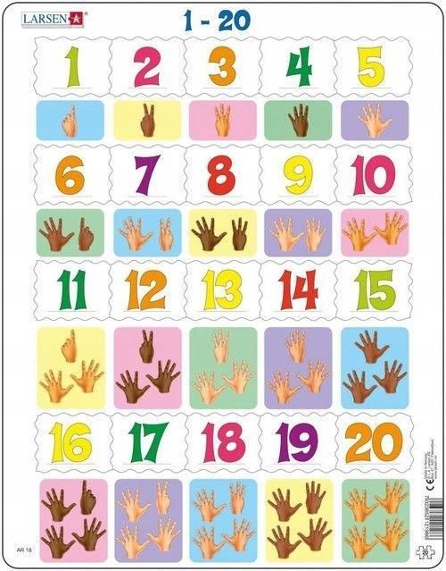 Edukacyjna układanka Maxi do nauki liczenia Układanka Maxi (36.5x28.5 cm) to doskonałe narzędzie do nauki nie tylko cierpliwości, ale także języka, matematyki, geografii i wiedzy ogólnej. Wykonana z grubej tektury, układanka posiada specjalnie dobrane elementy, które pomagają w przyswojeniu wiedzy z różnych dziedzin. Naucz się liczyć od 1 do 20! Czy potrafisz policzyć od 1 do 20? Jeśli tak, powiedz "MOGĘ!" a następnie wykorzystaj swoje ręce i wewnętrznego matematyka, aby rozwiązać tę fascynującą łamigłówkę. Zabawa matematyczna będzie jeszcze przyjemniejsza dzięki tej kolorowej i wciągającej układance! W przystępny sposób nauczysz się liczyć od 1 do 20 oraz dodawania liczb. Układanka składa się z 20 elementów o zaokrąglonych kształtach, utrzymanych w żywych kolorach i przedstawiających liczby. Puzzle są rozmieszczone w 4 rzędach na tle z ilustracjami dłoni w różnorodnych kolorach. Rysunki te przedstawiają odpowiednią liczbę palców ułatwiając wizualną naukę dzieci. Jakość i tradycja marki Larsen Ponad 75 lat doświadczenia w tworzeniu wysokiej jakości układanek przyczyniło się do stale rozwijającej się reputacji firmy Larsen. Produkowane w Norwegii z dbałością o każdy detal z grubej (4mm) tektury, układanki cieszą się zarówno wysoką jakością, jak i atrakcyjnym wyglądem. Współpraca z fińską firmą Tactic Oy umożliwiła przekazanie tej wartości także na rynku polskim. Larsen układanki są znane ze swojej: eleganckiej formy - nietypowe i oryginalne kształty sprawiają niezapomnianą frajdę podczas układania, doskonałej jakości - produkowane w Norwegii z dbałością o każdy szczegół, starannej selekcji obrazów - odpowiednie dla każdego wieku, edukacyjnych walorów - układanki przyczyniają się do wspomagania rozwoju dzieci, zlokalizowanych wzorów - dostępnych dla różnych rynków. EAN: 7023852121986