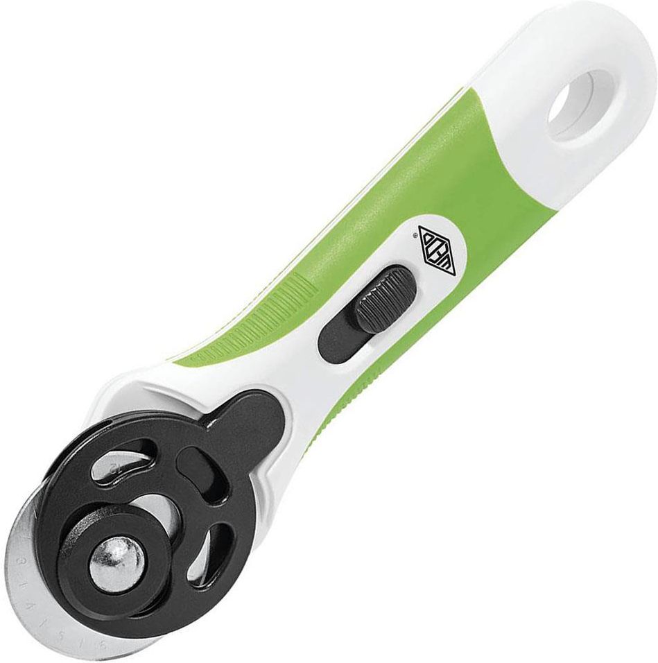 Wedo Comfortline nóź krążkowy ze zintegrowana osłona tarczy (mechanizm ślizgowy) bardzo ostre ostrze ze stali węglowej tnie z łatwością i precyzja do ciecia tkanin, skóry, papieru i winylu wygodny uchwyt z gumowymi wstawkami antypoślizgowymi prowadnica ostrza jest odwracalna i może być stosowana przez prawoi leworęcznych dodatkowe ostrze do ciecia ząbkowego w indywidualnym pudełku doprzechowywania średnica ostrzy: 45mm, nóź 19,2 x5 x2,6cm kolor: biało-zielony opakowanie: blister
