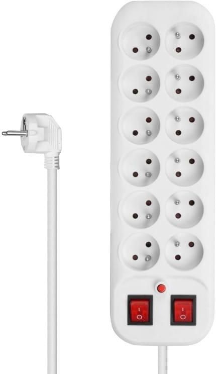 Przedłużacz dwurzędowy 12 gniazd z 2 włącznikami, biały, 1,8 m Przedłużacz dwurzędowy z 12 gniazdami to idealne rozwiązanie do domu lub biura, które zapewnia wygodne i bezpieczne zasilanie wielu urządzeń jednocześnie. Dzięki dwóm włącznikom (po jednym dla każdego rzędu gniazd), masz pełną kontrolę nad tym, które urządzenia są zasilane, co pozwala na oszczędność energii. Przedłużacz został wyposażony w uziemienie, co zwiększa bezpieczeństwo podczas użytkowania. Dzięki długości kabla wynoszącej 1,8 m, przedłużacz PPS51 zapewnia wygodę i elastyczność w umieszczaniu go tam, gdzie jest najbardziej potrzebny. Urządzenie posiada maksymalne obciążenie 16 A (3680 W), co czyni go odpowiednim do zasilania urządzeń o dużej mocy. Kompaktowy i funkcjonalny design sprawia, że biały przedłużacz dwurzędowy świetnie sprawdza się w biurach, warsztatach, a także w domach. Wykonany z trwałych materiałów, zapewnia długotrwałe i bezawaryjne użytkowanie. Cechy charakterystyczne przedłużacza PPS51 Rodzaj: przedłużacz. Typ: dwurzędowy. Ilość gniazd: 12. Uziemienie: tak. Wyłącznik napięcia: tak, 2 x (1 x dla każdego rzędu). Napięcie znamionowe: AC 230 V~ 50 Hz Maksymalne obciążenie: 16 A (3680 W). Długość przewodu: 1,8 m Rodzaj przewodu: 3G1.5 mm2 Kolor: biały. Opakowanie: zawieszka.