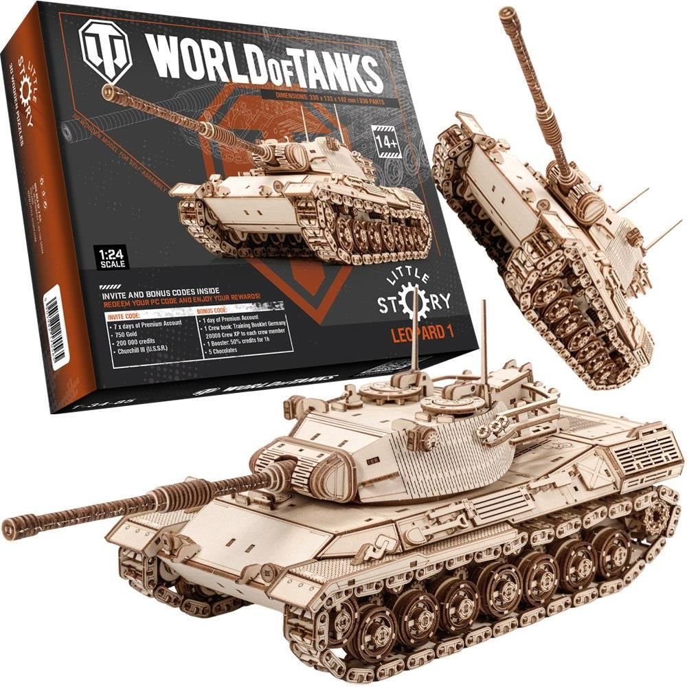 Little Story Wooden Models are our own products created with attention to every detail. We design and Manufacture them in Poland to deliver the highest quality possible! ⭐ 3D wooden puzzles in the shape of a Leopard 1 tank. The set is made of high-quality plywood and comes in the form of sheets with pre-cut and numbered pieces. Before assembling, separate the parts from the die-cut, and then connect them without glue, according to the detailed instructions included in the package. An educational toy that can also be used as a decoration after assembly. Note - the set may contain small parts, when assembling the puzzle, children must remain under adult supervision. The Leopard 1 tank model was created under the original World Of Tanks game license! Enter the free, team-based action game, where new historical vehicles are constantly appearing, the graphics are captivating, the locations are spectacular and the music is created by an entire orchestra. Show off your skills and face other players in thrilling clashes. Each tank includes a code for new players with which you will receive: 7 x days of Premium Account 750 Gold 200 000 Credits Tank Churchill III In addition, in the Leopard 1 tank you will find a special code that will provide you with additional rewards such as: 1 day of Premium Account 1x Crew book: Training Booklet Germany 20000 Crew XP to each crew member 1x Booster: 50% credits for 1h 5 Chocolates Wooden 3D Puzzle Leopard 1 - Tank Model for Self Assembly Enrich your collection with an extraordinary Leopard 1 tank 3D model made of high quality wood. This precisely designed set is the perfect opportunity to recreate one of the most famous tanks in the world, combining your fascination with military with the joy of creation. 3D puzzles are the perfect way to relax, develop manual skills and stimulate creativity, regardless of age. Main product features: High quality material - the puzzle is made of ecological wood, which ensures the durability, stability and aesthetic appearance of the model. Ideal for interior decoration after completion. Three-dimensional puzzles for adults and children - this model is great fun not only for modeling enthusiasts, but also for anyone looking for engaging entertainment. The set is suitable for people of all ages, making it an ideal gift. Different levels of difficulty - assembly requires precision and focus, making this model ideal for both experienced model assembly enthusiasts and beginners who want to try their hand at assembling advanced 3D puzzles. Great gift idea - the elegant and aesthetically pleasing design when assembled makes the Leopard 1 model a perfect gift for loved ones who appreciate both challenges and beautiful, decorative objects. https://hurt-idea.pl/product-pol-1774-Little-Story-Drewniane-Puzzle-Model-3D-Leopard-1.html