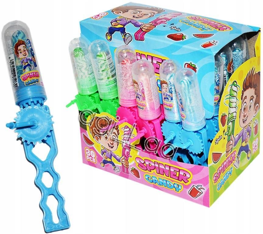 Lizak New Spiner Candy 30szt x 3,5g Pyszne lizaki owocowe w trzech kolorach, lizak „kręcony” za pomocą korbki. Kręcisz korbką, a lizak sam się obraca. W opakowaniu zbiorczym znajdziemy 30 sztuk. Waga pojedynczego lizaka 3,5 g. Waga opakowania zbiorczego 105 g. UWAGA! Produkt ten posiada co najmniej trzymiesięczny termin ważności, w innym przypadku poinformujemy o tym klienta przed nadaniem paczki.
