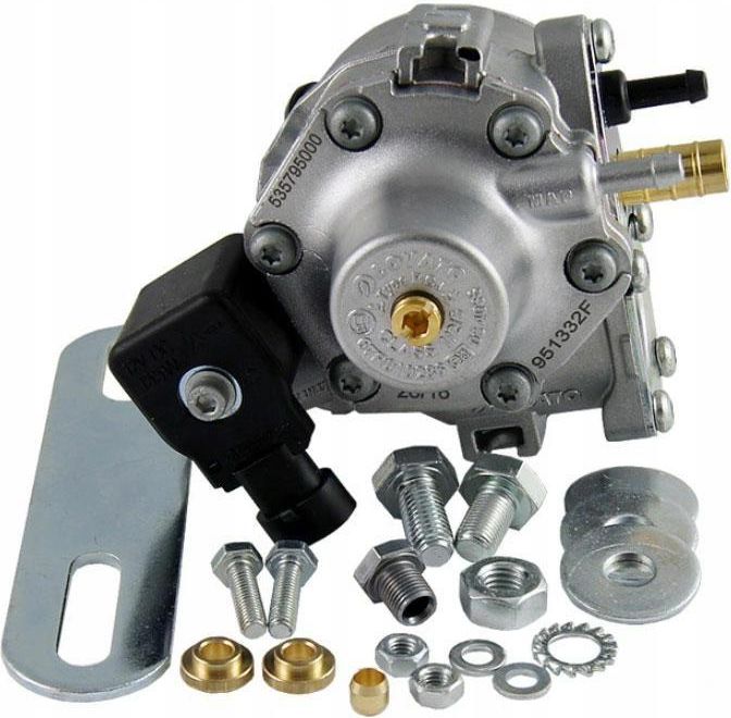 Reduktor Lovato RGJ. Parownik Lovato RGJ-3.2L jest kluczowym elementem instalacji sekwencyjnej IV generacji LPG Lovato Smart i Lovato Smart New. Lovato RGJ posiada zintegrowany i wbudowany elektrozawór gazu w fazie ciekłej oraz zespół filtrujący. Element stosowany do redukcji ciśnienia gazu z butli LPG do ciśnienia roboczego wymaganego dla prawidłowej pracy silnika na gazie LPG. Reduktor obsługuje pojazdy o mocy nieprzekraczającej 121kW / 165KM. Dane techniczne: - Maksymalna wydajność: 121kW / 165KM - Zasilanie: Przewód miedziany Cu 6mm lub odpowiednik - Gniazdo zasilania: M10x1.0 - Średnica zewnętrzna króća wyjścia gazu: 12mm - Średnica zewnętrzna króćców układu wodnego: 16mm - Średnica zewnętrzna króćca podciśnienia: 5mm - Temperatura robocza: -20°C ÷ 120°C Skład zestawu: - Reduktor - Baryłka uszczelniająca - Docisk baryłki uszczelniającej - Blacha montażowa - Drobne elementy montażowe
