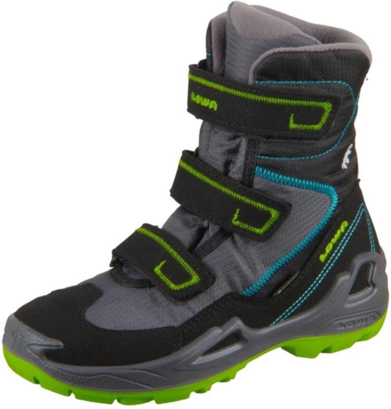 Chłopięce buty za kostkę LOWA / buty zimowe / śniegowce MILO GTX czarno-szara mieszanka tekstylno-syntetyczna - Goretex (wodoodporny, oddychający, izolujący) - zielono-niebieskie ozdobne szwy - trzy paski na rzepy - wyściełane wejście - ciepła tekstylna podszewka - wyjmowana wkładka - wzmocniony …