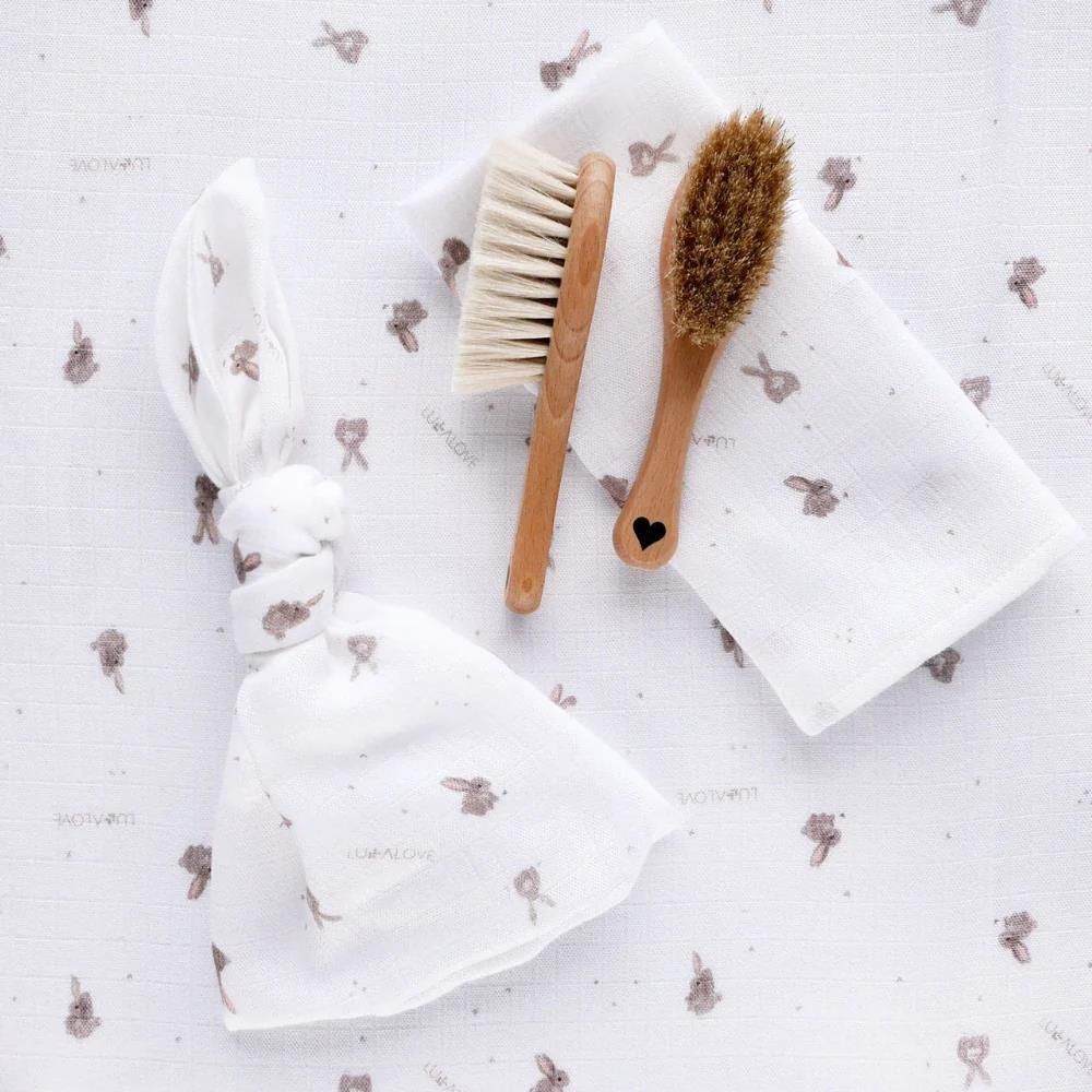 Szczotka z naturalnego włosia koziego i drewna bukowego w zestawie z muślinową myjką beżowe króliczki marki Lullalove. Lullalove Szczotka z naturalnego włosia koziego, niewielkich rozmiarów o bardzo delikatnym włosiu, idealna do delikatnej i wrażliwej skóry niemowląt. Doskonale relaksuje i wycisza …