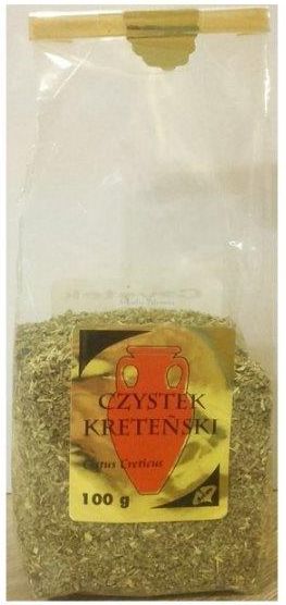 ASTRON Czystek kreteński 100gCzystek kreteński (Cistus creticus) występuje od rejonu Morza Śródziemnego aż po Morze Czarne. Ta należąca do rodziny posłonkowatych- czystkowatych krzewinka już w medycynie ludowej była stosowana do zwalczania infekcji i przeziębień. Obecnie działa korzystnie w stanach osłabienia i wspomaga organizm. Zawarte w czystku składniki oczyszczają organizm z toksyn i wolnych rodników tlenowych. Wykazują również lekkie działanie przeciwbakteryjne. POJEMNOŚĆ: 100g SPOSÓB UŻYCIA Dawkowanie zależne jest od kilku czynników: wieku, stanu zdrowia czy wykonywanej pracy. Przeważnie 1 czubatą łyżeczkę na filiżankę zalać wrzącą wodą i zaparzać ok. 8-10 minut. Cistus należy stosować minimum 4 tygodnie, sporadyczne zastosowanie nie przynosi wymiernych korzyści Napar z czystka można również używać do płukania gardła i przemywania skóry. SKŁAD Flawanoidy, żywice, kwasy fenolowe, olejek eteryczny – zawiera : manyol-oxide (manjol), alfa-kadinen, delta-kadinen, bulnezol, wiridiflorol, ledol, alfa-kopaen, beta-selinen, kubenen i 13-epi-manyol oxide. Kraj pochodzenia: Grecja - Kreta