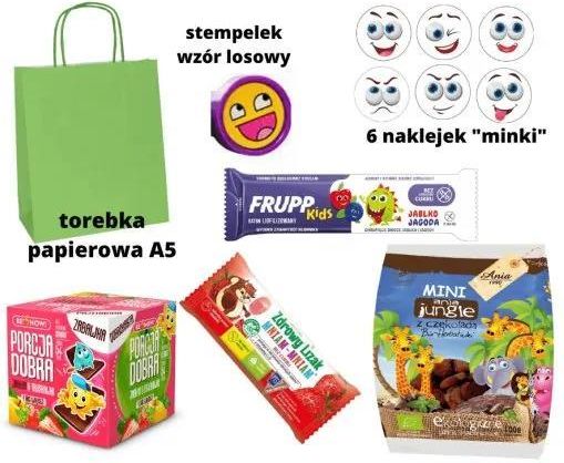 Zestaw prezentowy mały / drobny upominek / prezent dla dziecka (na Dzień Dziecka, Dzień Przedszkolaka, Święta, urodziny) w estetycznej papierowej torebce w rozmiarze A5. Zestaw zawiera przekąski i słodkości z dobrym składem i drobne prezenciki - stempelek (wzór losowy) i naklejki. W skład zestawu dokładnie wchodzą: 1. Zdrowy lizak owocowy 2. herbatniki mini jungle kakaowe 100g Ania 3. batonik owocowy Frupp 4. kostka z niespodzianką i przekąską Porcja Dobra 5. stempelek samotuszujący (wzór wysyłany losowo) 6. naklejki buźki / minki Smak / kolor poszczególnych produktów może być inny niż na zdjęciu. Taki zestaw prezentowy możemy wysłać w Państwa imieniu bezpośrednio do osoby, którą chcą Państwo obdarować. Jeśli odbiorca jest inny niż zamawiający prosimy o zaznaczenie tej informacji podczas finalizacji zamówienia - opcja "wysyłki zamówienia bez paragonu w paczce" oraz o podanie danych do wysyłki. Taka opcja (tzw. Zdrowa Poczta upominkowo - Słodyczowa czyli wysyłka prezentu za naszym pośrednictwem) to świetny pomysł gdy chcemy kogoś obdarować a nie mamy możliwości spotkania się z bliską osobą - niespodzianka gwarantowana! Istnieje możliwość zamówienia u nas większej ilości takich lub podobnych zestawów - polecamy tą opcję zarówno dla przedszkoli, żłobków, szkół, fundacji jak i firm (dla pracowników, klientów, na eventy) - zapraszamy do kontaktu w tej sprawie - info@zdroweslodycze.pl Możemy również przygotować podobne zestawy z innymi produktami w torebce (ustalenia indywidualne). Jeśli chcieliby Państwo zamienić / wymienić któryś produkt na inny, wykluczyć jakiś alergen lub wskazać konkretny smak danego smakołyku jaki ma być w zestawie - prosimy o kontakt lub komentarz do zamówienia.