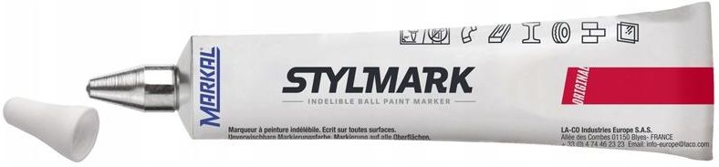 Marker w tubie Stylmark do znakowania wszelkich powierzchni, także chropowatych, brudnych, z zaolejonych i wilgotnych (możliwe jest również znakowanie elementów znajdujących się pod wodą) nadaje się do znakowania metalu (brudnego i czystego, gładkiego i chropowatego), kamienia i cegły, asfaltu i makadamu, plastiku, szkła i ceramiki, gumy i kauczuku, drewna (suchego i mokrego) i tekstyliów nie spływa przy znaczeniu powierzchni pionowych i poziomych do trwałego znaczenia farba po wyschnięciu jest nieusuwalna nanoszone farba odporna jest na warunki atmosferyczne, blaknięcie (UV), wpływ czynników chemicznych oraz wody morskiej czas schnięcia: 5 minut zakres temperatur stosowania markera: -20 °C do +70°C wytrzymałość oznakowania na temperaturę: do 200°C stalowa wytrzymała końcówka kulkowa o średnicy 6 mm (dostępne również końcówki o średnicy 2 i 3 mm) wolny od ksylenu bezpieczny dla zdrowia użytkownika masa pojedynczego markera 78 g znajduje zastosowanie w przemyśle hutniczym, odlewniczym, stoczniowym, metalurgicznym, budowlanym, oponiarskim i spawalniczymSposób użytkowania: marker należy trzymać prostopadle do znakowanej powierzchni przykładając metalową końcówkę do podłoża wcisnąć tubę wyginanie i rolowanie markera stwarza ryzyko pęknięciaproducent: Markal LA-CO (USA)