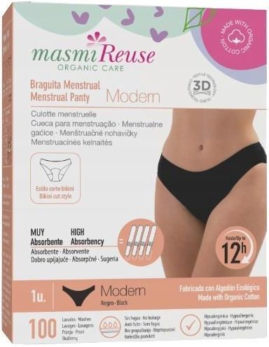Masmi, majtki menstruacyjne Modern, 100% certyfikowanej bawełny, rozmiar L Majtki menstruacyjne wykonane z certyfikowanej bawełny organicznej, to wielorazowa bielizna noszona podczas menstruacji, zastępująca podpaski. Produkt hipoalergiczny, posiadający aż 4 certyfikaty: GOTS, FSC, VEGAN i COTTON …
