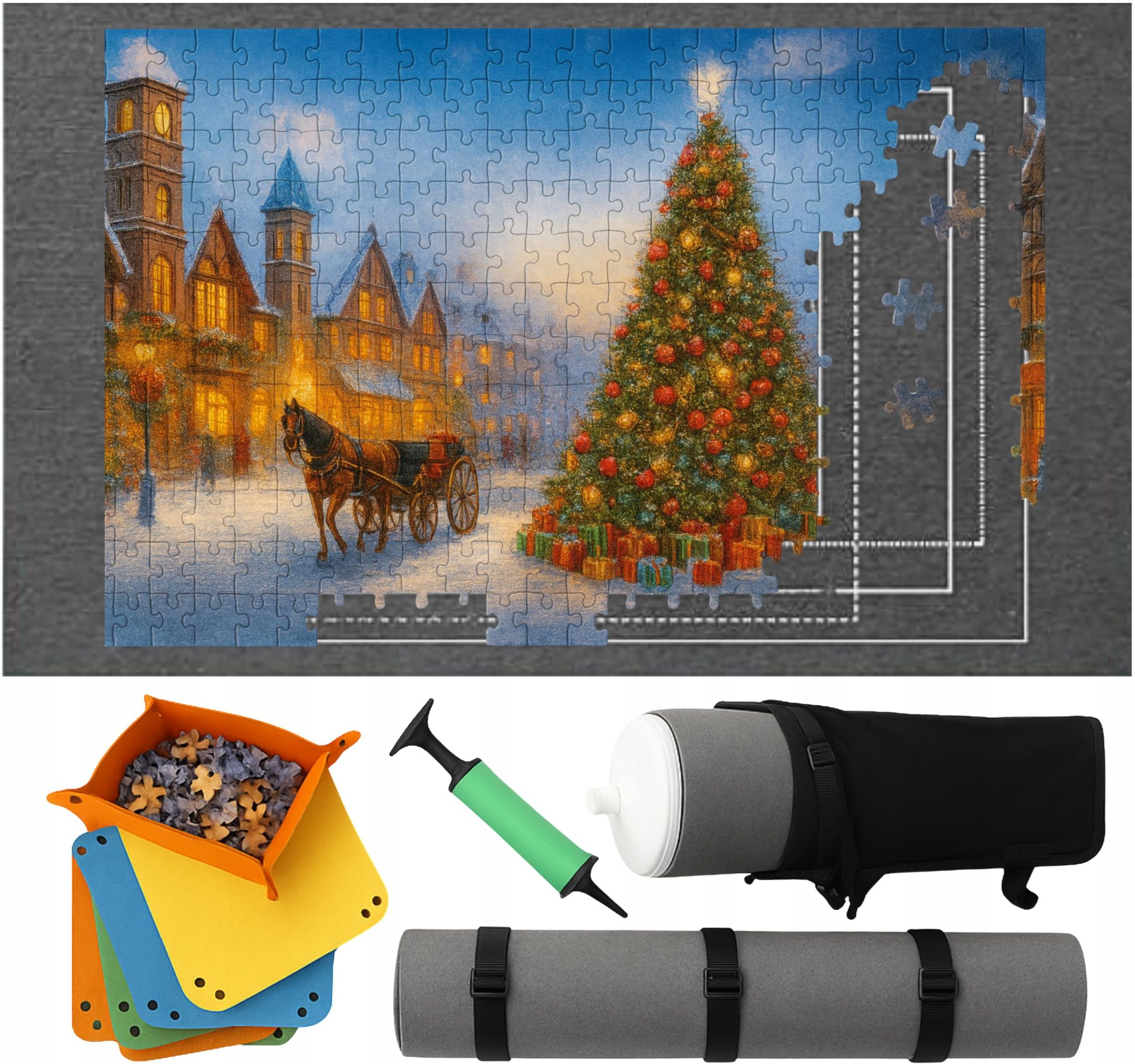 MATA DO UKŁADANIA PUZZLI NA 1500 ELEMENTÓW PODKŁADKA PLANSZA TKANINA PUZZLE CECHY MATY Stabilna konstrukcja – filcowa powierzchnia zapobiega przesuwaniu puzzli. Pompowany rulon z paskami – bezpiecznie utrzymuje matę w zwiniętej formie. Tuba z pompką w zestawie – szybkie pompowanie i opróżnianie bez wysiłku.✔️ Antypoślizgowa powierzchnia – puzzle nie przesuwają się podczas układania 4 kolorowe sakiewki – idealne do segregacji puzzli według kolorów lub kształtów. Nadrukowany wzór 6 rozmiarów puzzli – dopasujesz każdą układankę od 500 do 1500 elementów. Etui do przechowywania – praktyczne i kompaktowe rozwiązanie do transportu. WYGODNA TUBA Z POMPKĄ Dzięki pompowanemu rulonowi możesz w kilka sekund zwinąć matę, a puzzle pozostaną dokładnie tam, gdzie je zostawiłeś. Wystarczy: Ułożyć puzzli na macie, Owinąć ją wokół pompowanego wałka, Zabezpieczyć paskami – i gotowe! Dołączona pompka z dwoma końcówkami pozwala szybko nadmuchać lub spuścić powietrze, co sprawia, że mata jest zawsze gotowa do użycia. IDEALNA DLA CAŁEJ RODZINY Układanie puzzli to doskonały sposób na wspólne spędzanie czasu! Mata ułatwia organizację pracy kilku osób jednocześnie, a po zakończeniu zabawy – bezpiecznie przechowasz rozpoczętą układankę. To niezbędny gadżet dla każdego pasjonata puzzli – łączy funkcjonalność, estetykę i porządek w jednym! SPECYFIKACJA TECHNICZNA Materiał: Filc + tworzywo sztuczne Kolor: Wielokolorowa mata z nadrukiem Wymiary maty: 115 × 67 cm Wymiary etui: 80 cm Wymiary sakiewki: 15 × 15 cm ZESTAW ZAWIERA Filcowa mata do puzzli Pompowany rulon Pompka z dwoma końcówkami 4 kolorowe sakiewki do segregacji 3 paski zabezpieczające Pokrowiec do przechowywania Oryginalne opakowanie + instrukcja w języku polskim IDEALNY POMYSŁ NA PRZEZNT Mata do puzzli to doskonały upominek dla każdego miłośnika układanek — niezależnie od wieku! Praktyczna, estetyczna i funkcjonalna – zachwyci zarówno początkujących, jak i doświadczonych pasjonatów puzzli. Chcesz piękne opakowanie - skorzystaj z usługi "Zapakuj na prezent". Zainwestuj w jakość