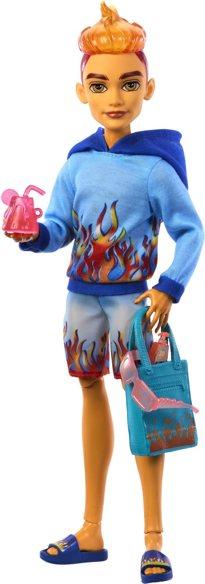 Monster High Wyspa Straszy-raj Heath Burns Lalka w bluzie z płomieniami i spodenkach kąpielowych z akcesoriami takimi jak okulary przeciwsłoneczne Ta lalka Monster High wygląda strasznie stylowo na wakacjach! Heath Burns ubrany w bluzę z kapturem i nadrukiem płomieni oraz spodenki kąpielowe ma …