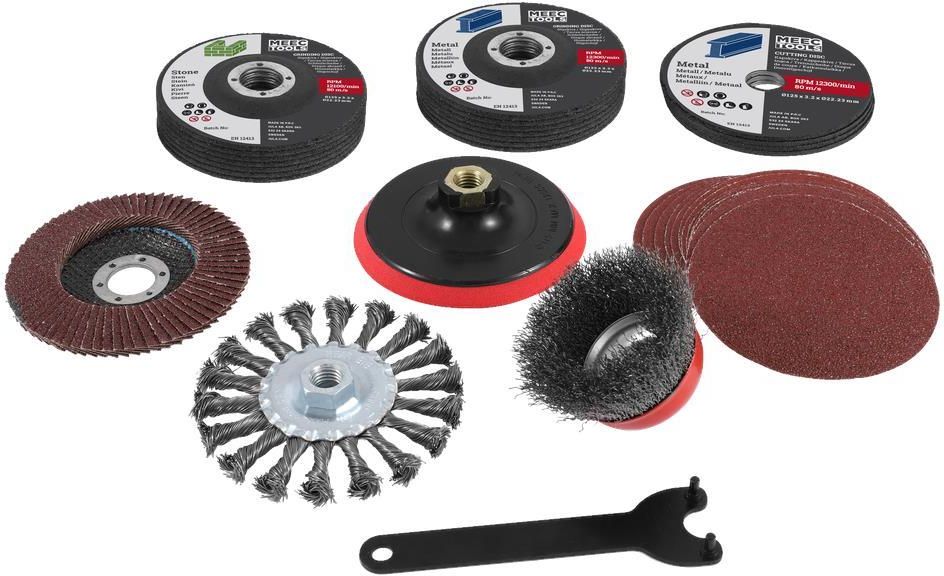 Zestaw do szlifowania/cięcia do szlifierki kątowej 35 elementów Meec Tools Meec Tools Narzędzia i akcesoria Do metalu i kamienia Zestaw do szlifowania i cięcia do szlifierki kątowej. Potrzebujesz solidnego i obszernego zestawu szlifierskiego? Ten zestaw marki Meec Tools zawiera najbardziej potrzebne narzędzia i akcesoria do prac związanych z cięciem i szlifowaniem wykonywanych przy użyciu szlifierki kątowej. Narzędzia i akcesoria Zestaw zwiera tarcze tnące i szlifierskie do metalu i kamienia, szczotkę tarczową, szczotkę centryczną, klucz montażowy, tarczę lamelową oraz arkusze papieru ściernego do uchwytu na papier ścierny. Zestaw składa się z 35 elementów: 1 tarcza lamelowa z powłoką z tlenku glinu, K40, Ø125 mm 1 szczotka tarczowa, uchwyt M14, Ø125 mm 1 szczotka centryczna, uchwyt M14, Ø 75 mm 1 czerwony uchwyt na papier ścierny z mocowaniem na rzep, uchwyt M14, Ø 125 mm 3 arkusze papieru ściernego do uchwytu, K36, Ø125 mm 2 arkusze papieru ściernego do uchwytu, K40, Ø125 mm 2 arkusze papieru ściernego do uchwytu, K50, Ø125 mm 3 arkusze papieru ściernego do uchwytu, K60, Ø125 mm 2 arkusze papieru ściernego do uchwytu, K80, Ø125 mm 2 tarcze tnące (do kamienia), grubość 3,2 mm, Ø125 mm 2 tarcze tnące (do metalu), grubość 3,2 mm, Ø125 mm 1 tarcza ścierna (do metalu), grubość 6 mm, Ø125 mm 5 tarcz ściernych (do kamienia), grubość 3,2 mm, Ø125 mm 8 tarcz ściernych (do metalu), grubość 3,2 mm, Ø125 mm 1 klucz montażowy Średnica: Ø100 / Ø125 mm Średnica otworu: 22,23 mm / M14 Wymiary: Text attribute: