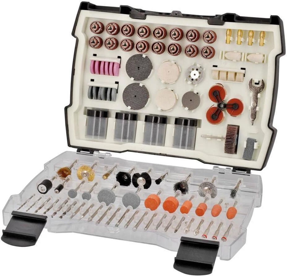 Zestaw szlifiersko-grawerski, 361 elementów.Bardzo duży zestaw akcesoriów marki Meec Tools. Jest w nim wszystko, czego potrzebujesz do szlifierko-grawerki! Diamentowe sztyfty szlifierskie i kamienie szlifierskie, tarcze ścierne i tnące oraz szczotki do czyszczenia, głowice ścierające, krążki …