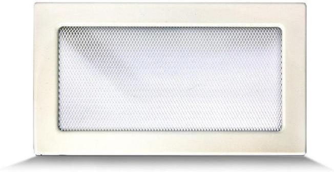Kratka kominkowa wykonana ze stali w kolorze białym, max temperatura powietrza to 180°C. Wymiar zewnętrznych 170x300 mm, a wymiar ramy i kasety wynosi 150x280 mm.