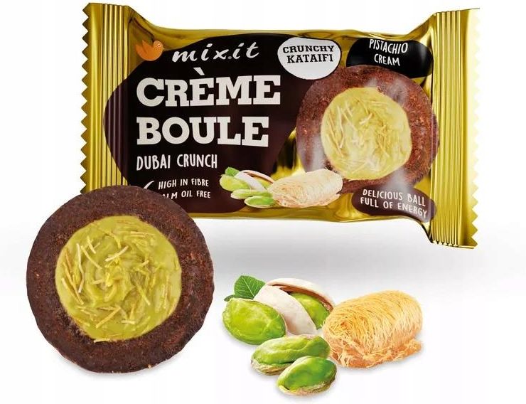 MIXIT CREME BOULE - DUBAI CRUNCH 30g Dubajska czekolada? Mamy coś lepszego! W Mixit ukryliśmy jej niesamowite nadzienie w pysznej Crème bouli! Te kremowe ciasteczka to oda do wyjątkowego połączenia słodkich daktyli, wysokiej jakości kakao Single Origin z Peru, delikatnych pistacji oraz kataifi. …