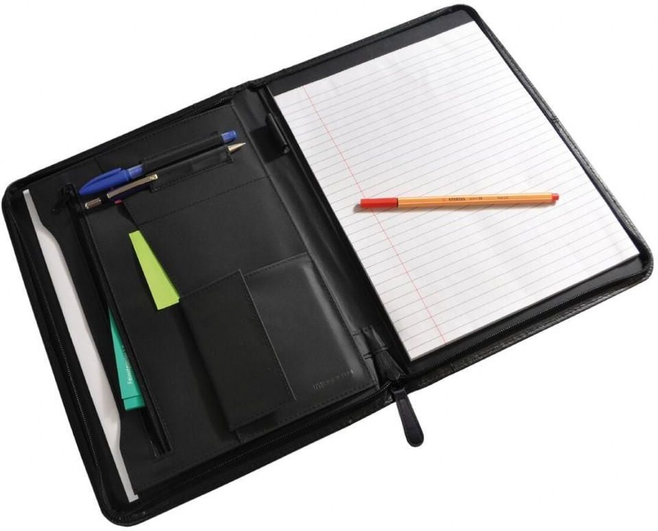 Aktówka skórzana - teczka na dokumenty A4 zapinana suwakiem niemieckiej marki Monolith Aktówka marki Monolith to doskonałe rozwiązanie na wszelkiego rodzaju oficjalne spotkania. Oferuje system przegródek i kieszeni na niezbędne dokumenty i akcesoria, a także miejsce na notatnik A4. Zapinana jest za pomocą wygodnego suwaka i wykonana została z wysokiej jakości skóry syntetycznej. Cechy produktu eleganckie wykończenie wykonana z wysokiej jakości, miękkiej skóry syntetycznej posiada wydzielone miejsce na notatnik formatu A4 kieszeń na dokumenty w formacie A4 kieszeń zapinana zamkiem błyskawicznym zamykana kieszonka na drobiazgi niewielka przegródka na karty, wizytówki itp. uchwyty na długopisy wygodne zamknięcie na suwak Opis Teczka konferencyjna jest jednym z najlepszych rozwiązań dla ludzi biznesu. Stanowi świetny dodatek do formalnego stroju oraz nadaje szyku i klasy. Aktówka niemieckiej marki Monolith wykonana została z wysokiej jakości skóry syntetycznej, dzięki czemu nie tylko prezentuje się niezwykle elegancko i stylowo, ale również zapewnia długotrwałe użytkowanie. Po rozpięciu suwaka użytkownik ma do dyspozycji wygodną kieszeń na dokumenty formatu A4, mniejszą kieszonkę zapinaną za pomocą zamka błyskawicznego oraz zamykaną kieszeń na różnego rodzaju drobiazgi. Wewnątrz znajdują się także uchwyty na długopisy, niewielka przegródka na karty, wizytówki itp., a także specjalnie wydzielone miejsce na notatnik formatu A4. kolor: czarny wymiary: 26 x 36 x 4 cm materiał: skóra syntetyczna kod produktu: 2870 xxx