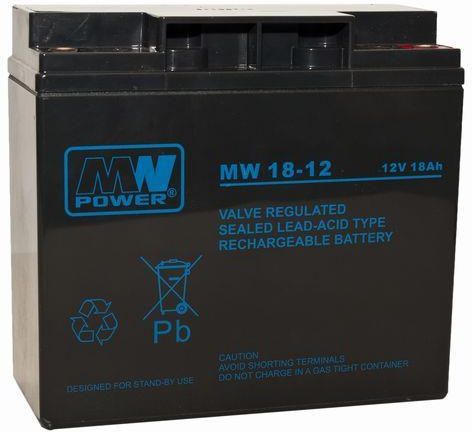 Akumulator VRLA 12V 18Ah MW Power Akumulatory MW Power serii MW są przeznaczone do stosowania zarówno w systemach zasilania awaryjnego jak i innych aplikacjach w których akumulator pracuje cyklicznie. Preferowane zastosowania akumulatorów tej serii to: zasilanie rezerwowe w UPS, w systemach automatyki oraz jako źródło energii w urządzeniach przenośnych, zasilanie silników i innych urządzeń w trybie pracy cyklicznej. Dla rozładowań 50% do 500 cykli pracy. Projektowana żywotność wynosi 6-9 lat dla 20-25 oC Akumulatory MW Power serii MW są przeznaczone do stosowania zarówno w systemach zasilania awaryjnego jak i innych aplikacjach w których akumulator pracuje cyklicznie. Preferowane zastosowania akumulatorów tej serii to: zasilanie rezerwowe w UPS, w systemach automatyki oraz jako źródło energii w urządzeniach przenośnych, zasilanie silników i innych urządzeń w trybie pracy cyklicznej. Dla rozładowań 50% do 500 cykli pracy. Projektowana żywotność wynosi 6-9 lat dla 20-25oC Dane techniczne: Producent: MW Power Model: MW 18-12 Napięcie: 12V Pojemność: 18Ah Rezystancja wewnętrzna: 10,5m? Maksymalny prąd ładowania: 5,5A Maksymalny prąd rozładowania: 195A (5sek) Wymiary: długość: 181mm; szerokość: 77mm; wysokość: 167mm; Waga: 5,7 kg Karta katalogowa Instrukcja użytkowania akumulatora Zasady eksploatacji