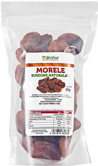 Suszenie to jedna z najstarszych metod konserwacji żywności. Wysuszone owoce zachowują takie same wartości jak ich świeże odpowiedniki, dodatkowo mogą być przechowywane przez dłuższy czas. Morele suszone na słońcu niesiarkowane mają ciemnobrązowy kolor. Morele są nie tylko bardzo smaczne, ale zawierają również wiele korzystnie wpływających na organizm składników. Przede wszystkim są to przeciwutleniacze, które wykazują działanie ochronne komórek organizmu, opóźniając proces ich starzenia się. Są bogatym źródłem żelaza, wapnia, fosforu, witaminy B i C oraz błonnika. Morele pozytywnie wpływają na ciśnienie krwi oraz pracę serca. Wspomagają prawidłową pracę układu pokarmowego. Wykazują właściwości lekko oczyszczające oraz ułatwiają wydalanie nadmiaru wody z organizmu. Owoce moreli wykazują działanie zasadotwórcze, dlatego polecane są osobom cierpiącym na nadkwasotę, ale i również osobom intensywnie trenującym sport. Zawierają beta-karoten, który chroni przed działaniem wolnych rodników, tym samym wspierając prawidłowy stan skóry. Zastosowanie: jako przekąska lub dodatek do potraw (np. do musli). Składniki: suszone owoce moreli zwyczajnej (Prunus armeniaca). Ważne wskazówki: przechowywać w temperaturze pokojowej, w suchym miejscu, w szczelnie zamkniętym opakowaniu. Może zawierać: gluten, soję, orzechy arachidowe (i inne orzechy), sezam, gorczycę oraz dwutlenek siarki. Masa netto: 400g. Kraj pochodzenia: Turcja. Producent: MYVITA.