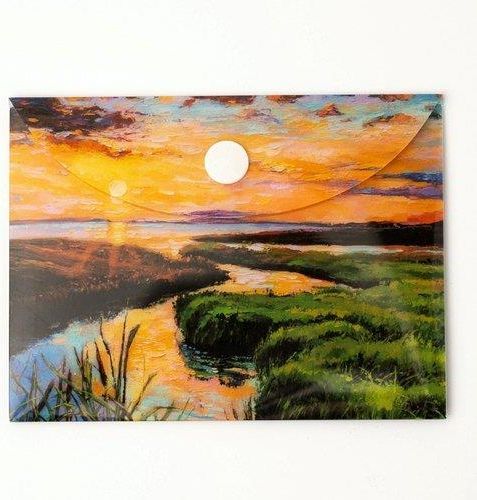 Ozdobna teczka kopertowa VISTA, wykonana z trwałego polipropylenu z nadrukiem w postaci impresjonistycznego widoku ujścia rzeki wpływającej do jeziora. Zamykana na zatrzask typu napa. Dzięki pełnemu zadrukowi, zawartość teczki pozostaje niewidoczna na zewnątrz. Idealne rozwiązanie do przechowywania dokumentów lub niewielkich płaskich przedmiotów. Specyfikacja: •format A6 (120 x 90 mm) •wykonana z polipropylenu •zamykanie na zatrzask typu napa •grubość tworzywa 28 mikronów