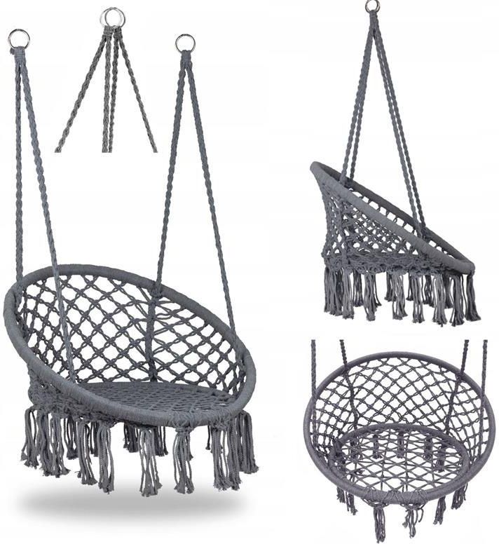 Huśtawka Bocianie Gniazdo Fotel Wiszący Ogrodowa Boho do Domu Ogrodu 120cm- szary Elegancki i stylowy fotel wiszący to świetna propozycja dla osób, które cenią sobie relaks na świeżym powietrzu. Wiszący kosz łączy w sobie nie tylko wygodę i trwałość ale dodatkowo jest wykonany według najnowszych trendów. Dzięki ciekawej konstrukcji i zastosowaniu specjalnych splotów oraz ozdobnych frędzli, kosz idealnie podkreśli nowoczesny wystrój oraz nada stylu każdemu miejscu. Taki hamak możesz powiesić zarówno w domu w roli wiszącego fotela, jak i w ogrodzie jako huśtawkę ogrodową. Huśtawka została zaprojektowana z myślą o komforcie, siedzisko mocowane jest na solidnych metalowych pierścieniach, które możesz zawiesić na specjalnych hakach, stelażach lub gałęziach. W dolnej części siedziska znajdują się ozdobne frędzelki nadające huśtawce niepowtarzalnego stylu. Siedzisko wykonane jest z wytrzymałej plecionej bawełny, odpornej na warunki atmosferyczne. Cały kształt fotela został zaprojektowany w taki sposób, aby zapewniał maksymalny komfort podczas odpoczynku. Delikatne bujanie i huśtanie z pewnością umilą naukę oraz czytanie książek. Instrukcja montażu: W huśtawce zostały zastosowane wytrzymałe, plecione sznurki, które zakończone są specjalnymi metalowymi uchwytami, dzięki czemu sam montaż nie sprawia trudności i można go wykonać w domowym zaciszu. Uchwyty pozwalają na zamontowanie fotela na dwa sposoby: - Obrót o 360° - jedynym potrzebnym elementem do zawieszenia będzie hak/kotwica (brak w zestawie) - Huśtanie się w przód i w tył - w tym sposobie niezbędne okażą się przysufitowe haki/kotwice lub zwykły stelaż, na którym huśtawka będzie mogła stabilnie zwisać (brak w zestawie) Maksymalne obciążenie: 150 kg Mocowanie: jedno lub dwupunktowe Szerokość siedziska: 80 cm Głębokość siedziska: 61 cm Wysokość oparcia: 40 cm Długość sznurków z uchwytami: 90 cm (krótszy); 105 cm (dłuższy) Wysokość całkowita (bez frędzli): 120 cm Wymiary opakowania: 81 (szer.) x 4 (gł.) x 82 (wys.) cm Producent: Nobo Kids Głębokość: 4 Szerokość: 81 Wysokość: 82 Kod producenta: HM197831