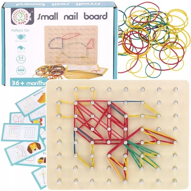 Montessori Tablica Drewniana Układanka Gumkami Kreatywna Wzory Geoplan To edukacyjna gra kreatywności oraz wyobraźni połączona z nauką figur geometrycznych, kolorów czy liczenia. W zestawie znajdują się karty dwustronne z przedstawionymi różnymi kształtami i obrazkami o różnej trudności. Celem …