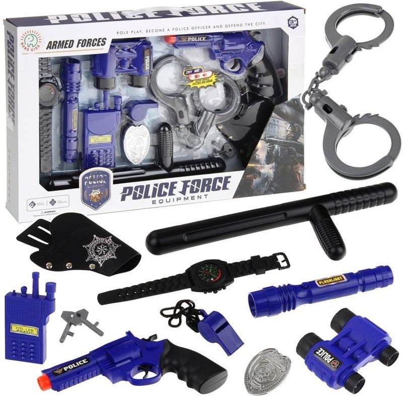 Zestaw Strój Policyjny Policjant Pistolet Kajdanki Krótkofalówka Zegarek Jeśli Twój syn marzy o tym, by zostać stróżem prawa, mamy coś idealnego! Z wyposażeniem, jakie znajduje się w przedstawionym zestawie, dziecko zaprowadzi porządek na balu, w domu i podwórku. Zawiera wszelkie niezbędne akcesoria, aby zostać policjantem lub policjantką, wcielając się w służbę mundurową. Bogato wyposażony zestaw, pozwoli przeżyć Twojemu dziecku wspaniałe chwile radosnej zabawy. Możesz tu znaleźć pistolet z kaburą, gdzie po naciśnięciu spustu, słychać odgłosy jak w realistycznym pistolecie. W zestawie: pistolet kajdanki kluczyki do kajdanek kabura na pistolet pałka lornetka odznaka krótkofalówka gwizdek latarka zegarek Sugerowany minimalny wiek (według informacji podanej przez producenta na opakowaniu): 3 lata+ Ilość elementów w zestawie: 11 Wymiary pistoletu: 3,5 (szer.) x 18 (dł.) x 13 (wys.) cm Długość pałki: 29,5 cm Długość latarki: 15,5 cm Wymiary lornetki: 9,5 (szer.) x 8,5 (dł.) x 3,5 (wys.) cm Zasilanie pistoletu: 2 baterie AG13/LR44 1,5 V (w zestawie baterie demonstracyjne) Zasilanie latarki: 3 baterie AG13/LR44 1,5 V (w zestawie baterie demonstracyjne) Wymiary opakowania: 46 (szer.) x 5 (gł.) x 28,5 (wys.) cm OSTRZEŻENIE! Nieodpowiednie dla dzieci w wieku poniżej 3 lat. Do użytku pod bezpośrednim nadzorem osób dorosłych z uwagi na małe elementy i możliwość zadławienia. Należy usunąć opakowanie przed podaniem zabawki dziecku. Opakowanie należy zachować, gdyż zawiera ważne informacje. Kolory i specyfikacja zawartości mogą się różnić od podanych na opakowaniu. Usuwanie wyeksploatowanych urządzeń elektrycznych i elektronicznych. Symbol na produkcie lub jego opakowaniu oznacza, że produkt nie powinien być zaliczany do odpadów domowych. Należy go przekazać do odpowiedniego punktu, który zajmuje się zbieraniem i recyklingiem urządzeń elektrycznych i elektronicznych. Prawidłowe usunięcie produktu zapobiegnie potencjalnym negatywnym konsekwencjom dla środowiska naturalnego i zdrowia ludzkiego, których przyczyną mogłoby być niewłaściwe usuwanie produktu. Recykling materiałów pomaga w zachowaniu surowców naturalnych. Aby uzyskać szczegółowe informacje o recyklingu tego produktu, należy skontaktować się z władzami lokalnymi, firmą świadczącą usługi oczyszczania lub sklepem, w którym produkt został kupiony. Sposób montażu i wymiany baterii: Należy używać jedynie baterii takiego typu jak to zostało pokazane na opakowaniu. Baterie należy wkładać z zachowaniem prawidłowej biegunowości zgodnie z oznaczeniami na zabawce/opakowaniu. Niewłaściwy montaż może spowodować zniszczenie zabawki lub spowodować wyciek elektrolitu a nawet pożar czy wybuch baterii. Nie należy mieszać różnych typów baterii a także nowych ze starymi. Wyczerpane baterie należy wyjąć z zabawki. Baterie należy wyjąć również w sytuacji kiedy zabawka przez dłuższy czas pozostaje nieużywana. W przeciwnym razie baterie mogą się wylać i spowodować uszkodzenie zabawki. Nie wolno wrzucać baterii do ognia. Stwarza to niebezpieczeństwo wybuchu. Nie należy otwierać baterii. Wymianę baterii powinna wykonać osoba dorosła. Nie wolno zwierać zacisków zasilania. Ostrzeżenie: Niezachowanie powyższych środków ostrożności może narazić użytkownika na niebezpieczeństwa związane z korzystaniem z wyrobu, którego modelem w skali jest zabawka. Zabawka musi być przechowywana w miejscu niedostępnym dla dzieci poniżej wieku określonego przez producenta. Jeśli Twój syn marzy o tym, by zostać stróżem prawa, mamy coś idealnego! Z wyposażeniem, jakie znajduje się w przedstawionym zestawie, dziecko zaprowadzi porządek na balu, w domu i podwórku. Zawiera wszelkie niezbędne akcesoria, aby zostać policjantem lub policjantką, wcielając się w służbę mundurową. Bogato wyposażony zestaw, pozwoli przeżyć Twojemu dziecku wspaniałe chwile radosnej zabawy. Możesz tu znaleźć pistolet z kaburą, gdzie po naciśnięciu spustu, słychać odgłosy jak w realistycznym pistolecie. W zestawie: pistolet kajdanki kluczyki do kajdanek kabura na pistolet pałka lornetka odznaka krótkofalówka gwizdek latarka zegarek Sugerowany minimalny wiek (według informacji podanej przez producenta na opakowaniu): 3 lata+ Ilość elementów w zestawie: 11 Wymiary pistoletu: 3,5 (szer.) x 18 (dł.) x 13 (wys.) cm Długość pałki: 29,5 cm Długość latarki: 15,5 cm Wymiary lornetki: 9,5 (szer.) x 8,5 (dł.) x 3,5 (wys.) cm Zasilanie pistoletu: 2 baterie AG13/LR44 1,5 V (w zestawie baterie demonstracyjne) Zasilanie latarki: 3 baterie AG13/LR44 1,5 V (w zestawie baterie demonstracyjne) Wymiary opakowania: 46 (szer.) x 5 (gł.) x 28,5 (wys.) cm OSTRZEŻENIE! Nieodpowiednie dla dzieci w wieku poniżej 3 lat. Do użytku pod bezpośrednim nadzorem osób dorosłych z uwagi na małe elementy i możliwość zadławienia. Należy usunąć opakowanie przed podaniem zabawki dziecku. Opakowanie należy zachować, gdyż zawiera ważne informacje. Kolory i specyfikacja zawartości mogą się różnić od podanych na opakowaniu. Usuwanie wyeksploatowanych urządzeń elektrycznych i elektronicznych. Symbol na produkcie lub jego opakowaniu oznacza, że produkt nie powinien być zaliczany do odpadów domowych. Należy go przekazać do odpowiedniego punktu, który zajmuje się zbieraniem i recyklingiem urządzeń elektrycznych i elektronicznych. Prawidłowe usunięcie produktu zapobiegnie potencjalnym negatywnym konsekwencjom dla środowiska naturalnego i zdrowia ludzkiego, których przyczyną mogłoby być niewłaściwe usuwanie produktu. Recykling materiałów pomaga w zachowaniu surowców naturalnych. Aby uzyskać szczegółowe informacje o recyklingu tego produktu, należy skontaktować się z władzami lokalnymi, firmą świadczącą usługi oczyszczania lub sklepem, w którym produkt został kupiony. Sposób montażu i wymia