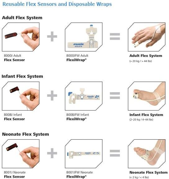 Plastry typu FlexiWrap do mocowania pulsoksymetru firmy Nonin 8000JFW. Dostępne warianty NONIN 4097-000 - Plastry FlexiWrap do sensora 8000JFW dla dorosłych (op. 25 szt.), NONIN 8008JFW - Plastry FlexiWrap do sensora 8008JFW dla niemowląt (op. 25 szt.), NONIN 8001JFW - Plastry FlexiWrap do sensora 8001JFW dla noworodków (op. 25 szt.).