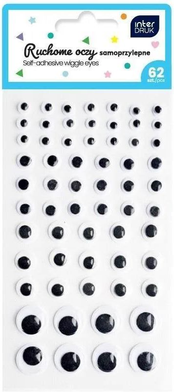 Interdruk - Oczy Ruchome Samoprzylepne Oczy ruchome samoprzylepne to doskonały dodatek do kreatywnych projektów, zarówno dla dzieci, jak i dorosłych. Zestaw zawiera 62 sztuki oczu, które dzięki samoprzylepnej powierzchni można szybko i łatwo przytwierdzać do różnych materiałów. Te drobne elementy otwierają morze możliwości w tworzeniu prac artystycznych, dekoracji czy personalizowanych prezentów. Można je przyklejać wszędzie tam, gdzie potrzebny jest odrobina humoru i wyobraźni, od prostych rysunków po bardziej złożone projekty manualne. Dzięki różnym rozmiarom oczu, można uzyskać różnorodne efekty, które przyciągną uwagę i rozbudzą kreatywność. Idealne do użytku edukacyjnego oraz zabawy, pobudzają do twórczego myślenia i rozwijają zdolności manualne. Wybierając te oczy ruchome, inwestujesz w swoją kreatywność i możliwość wyrażania siebie w niebanalny sposób. EAN: 5902277356895