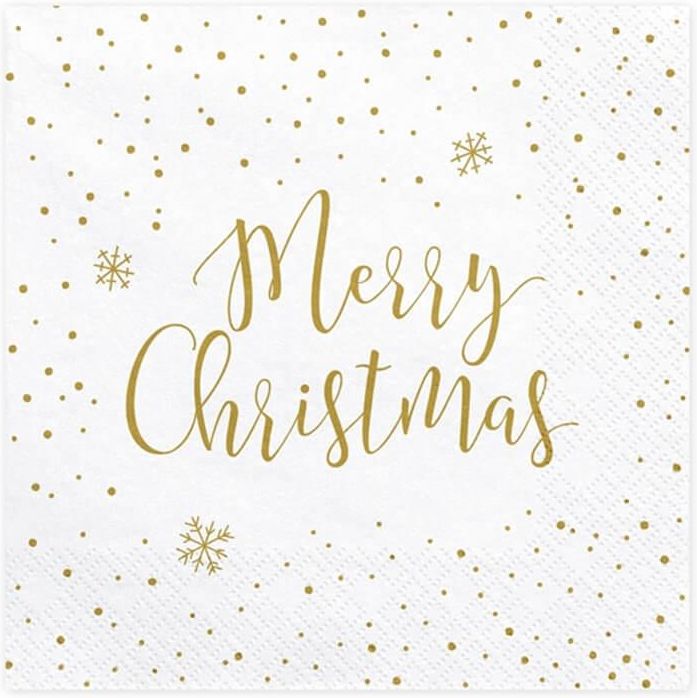 Serwetki to nieodzowny element dekoracji stołu. Są nie tylko bardzo funkcjonalne, ale również dopełniają wystrój urodzin, wesela, uroczystej kolacji, a także codziennych posiłków w kameralnym gronie najbliższych osób. Nie może ich zatem zabraknąć na świątecznym stole! Bożonarodzeniowe serwetki z napisem "Merry Chistmas" to wspaniała dekoracja świątecznego stołu, która uświetni ten magiczny czas. Papierowe białe serwetki ze złotym napisem dodadzą świątecznej atmosfery pełniąc rolę nietuzinkowej ozdoby, która zachwyci naszych zaproszonych gości!