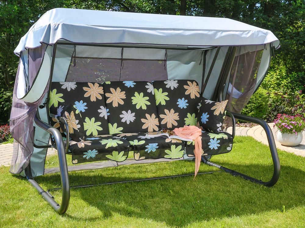 Luksusowa huśtawka 4-osobowa Venezia Lux D001-04 z rozkładanym siedziskiem, mocowanym na sprężynach. Solidna, mocna konstrukcja stelaża huśtawki, grubość rury nośnej : fi 63 x 1,5 mm. Stelaż malowany proszkowo farbami poliestrowo-epoksydowymi. Siedzisko wyróżnia się użytecznością - posiada możliwość rozłożenia do pozycji leżącej. Kolor stelaża: antracyt. Stelaż jest przystosowany do zamontowania stolików bocznych, które dołączone są do zestawu. Hustawka posiada wykonany z poliestru daszek wraz z moskitierą. Posiada on specjalne tunele dostosowane do konstrukcji dachu huśtawki. Kolor daszka: jasnoszary. Moskitiera jest odpinana, a siatka wyposażona została w 5 zamków błyskawicznych na bokach i 1 mocujący do dachu. W komplecie z huśtawką: 2 x stolik boczny 3 x poduszka w deseniu D001-04 2 x podłokietnik z rzepem mocowanym do stelaża, wypełniony gąbką typu flocke 4 x poduszka ozdobna w deseniu C035 – 010B Wypełnienie poduszek na siedzisko: pianka poliuretanowa owijana włókniną poliestrową. Tkanina: wierzch i spód wykonany z tkaniny bawełnianej, wolant obszyty lamówką poliestrową. W zgięciu troczki do mocowania.
