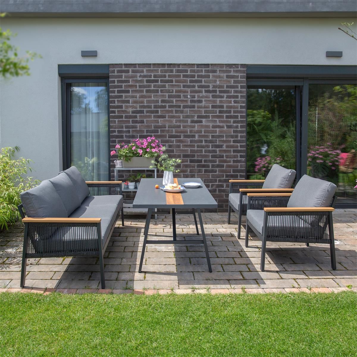 Zestaw mebli ogrodowych: styl i funkcjonalnośćZestaw mebli ogrodowych Ada to doskonały wybór dla tych, którzy cenią sobie połączenie stylu i praktyczności. Wszystkie elementy kompletu posiadają aluminiowy stelaż, co sprawia, że są lekkie i łatwe do przestawiania. Podłokietniki wykonane z aluminium, imitujące drewno, nadają meblom atrakcyjny wygląd i przyjemny dotyk. Boki foteli i sofy zaplecione z technorattanu przypominającego sznurek, który jest odporny na deszcz i promienie UV, sprawiają, że meble są nie tylko estetyczne, ale i trwałe. Nowoczesny design doskonale komponuje się z tarasami, dodając im elegancji.Trwałość i komfort użytkowaniaBlat stołu wykonany z hartowanego szkła i płyty SPC łączy wygląd drewna z wyjątkową wytrzymałością na uszkodzenia mechaniczne i wilgoć. Poduszki dołączone do mebli wykonane są z tkaniny Olefin, która zapewnia wygodę i trwałość. Zestaw mebli ogrodowych Ada to nie tylko funkcjonalność, ale również komfort użytkowania