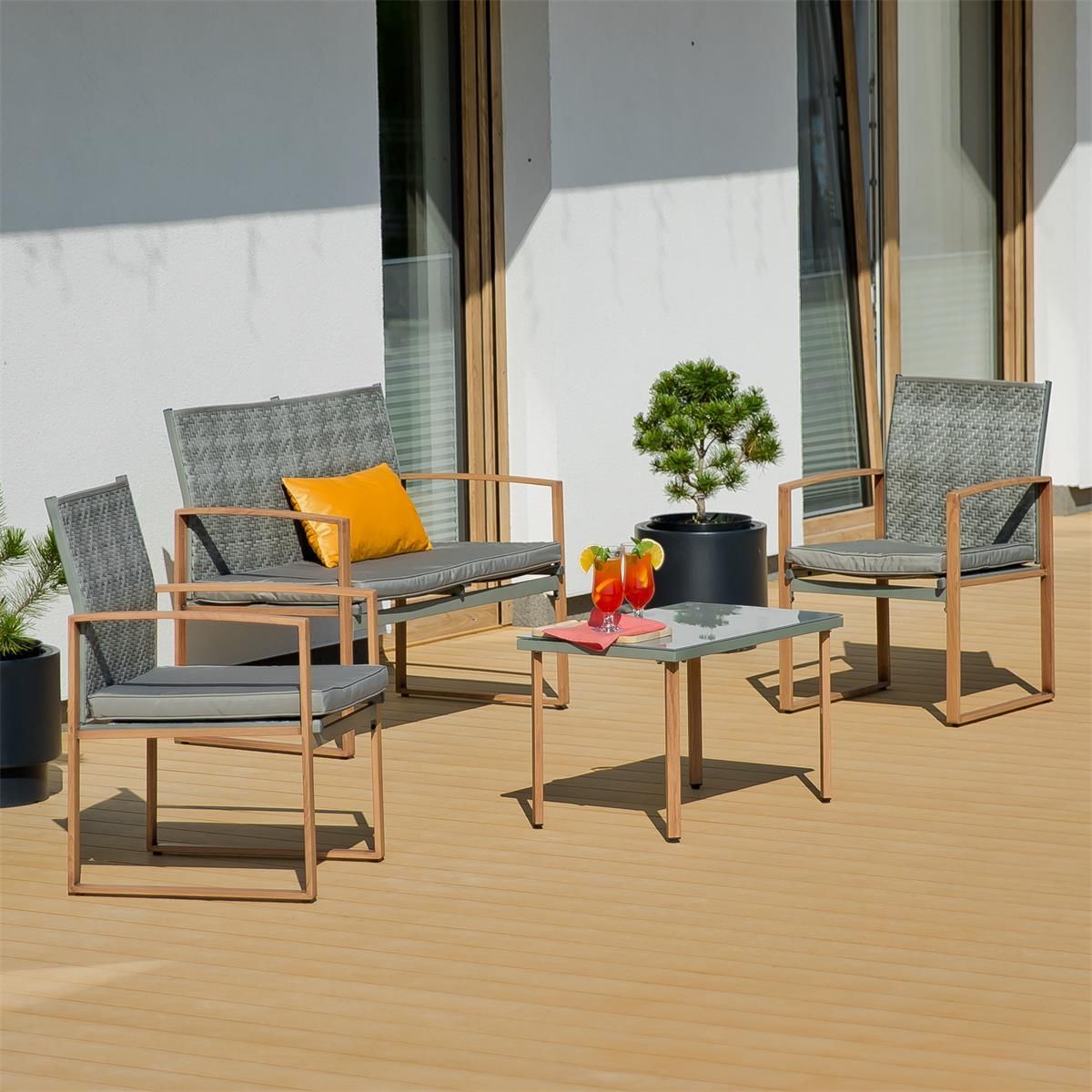 Zestaw mebli ogrodowych technorattanowychNasz zestaw mebli łączy w sobie wysoką jakość wykonania z niezawodną trwałością. Technorattan, użyty do produkcji, jest materiałem, który nie tylko doskonale imituje naturalny rattan, ale też jest wyjątkowo odporny na zmienne warunki atmosferyczne, takie jak deszcz czy promienie UV. Stalowe stelaże i nogi, choć lekkie, są solidne i stabilne, a ich drewnopodobne wykończenie dodaje meblom uroku. W zestawie znajdują się również wygodne poduszki z poliestru, wyposażone w praktyczne zamki błyskawiczne, co ułatwia ich czyszczenie lub wymianę.Trwałość i estetyka każdego elementuDbając o każdy szczegół, zapewniamy, że nasze meble będą służyć przez wiele sezonów. Technorattan pozwala na łatwe utrzymanie czystości, wystarczy przetrzeć wilgotną ścierką. Zalecamy przechowywanie mebli w suchym miejscu w okresie zimowym oraz zabezpieczanie ich przed wilgocią, aby zachować ich estetyczny wygląd na dłużej. Dodatkowo, blaty stoł
