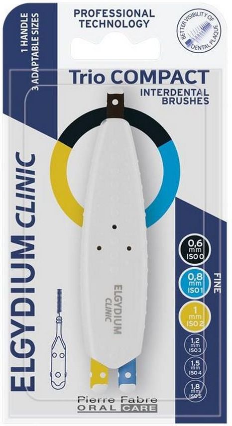 ELGYDIUM CLINIC TRIOCOMPACT to innowacyjne szczoteczki międzyzębowe, które zapewniają skuteczną higienę przestrzeni międzyzębowych, pomagając w usuwaniu płytki bakteryjnej i resztek jedzenia z trudno dostępnych miejsc. Cechy i korzyści 3 wymienne końcówki w jednym zestawie – oszczędność miejsca i wygoda użytkowania Mix rozmiarów (ISO 0, 1, 2) – dopasowanie do różnych przestrzeni międzyzębowych Ergonomiczna rączka – wygodne użytkowanie i lepsza kontrola Delikatne i wytrzymałe włókna – skutecznie czyszczą, nie podrażniając dziąseł W zestawie ochronna nasadka – higieniczne przechowywanie Dzięki kompaktowej konstrukcji i wysokiej jakości wykonaniu szczoteczki ELGYDIUM CLINIC TRIOCOMPACT to doskonały wybór dla osób dbających o kompleksową higienę jamy ustnej. Opakowanie zawiera 1 rączkę 3 wymienne końcówki o różnych szerokościach (ISO 0, 1, 2) Idealne dla osób noszących aparaty ortodontyczne, implanty oraz dbających o zdrowe dziąsła i czyste przestrzenie międzyzębowe. Dostępne rozmiary ISO 0 – ELGYDIUM Clinic Trio Compact 000 – 3 x 0,6 mm ISO 1 - ELGYDIUM Clinic Trio Compact 111 – 3 x 0,8 mm ISO 0, 1, 2 - ELGYDIUM Clinic Trio Compact 012 – 0,6 mm 0,8 mm 1 mm ISO 1, 2, 3 - ELGYDIUM Clinic Trio Compact 123 – 0,8 mm 1 mm 1,2 mm ISO 1, 4, 5 - ELGYDIUM Clinic Trio Compact 145 – 0,8 mm 1,5 mm 1,8 mm ISO 4 - ELGYDIUM Clinic Trio Compact 444 – 3 x 1,5 mm