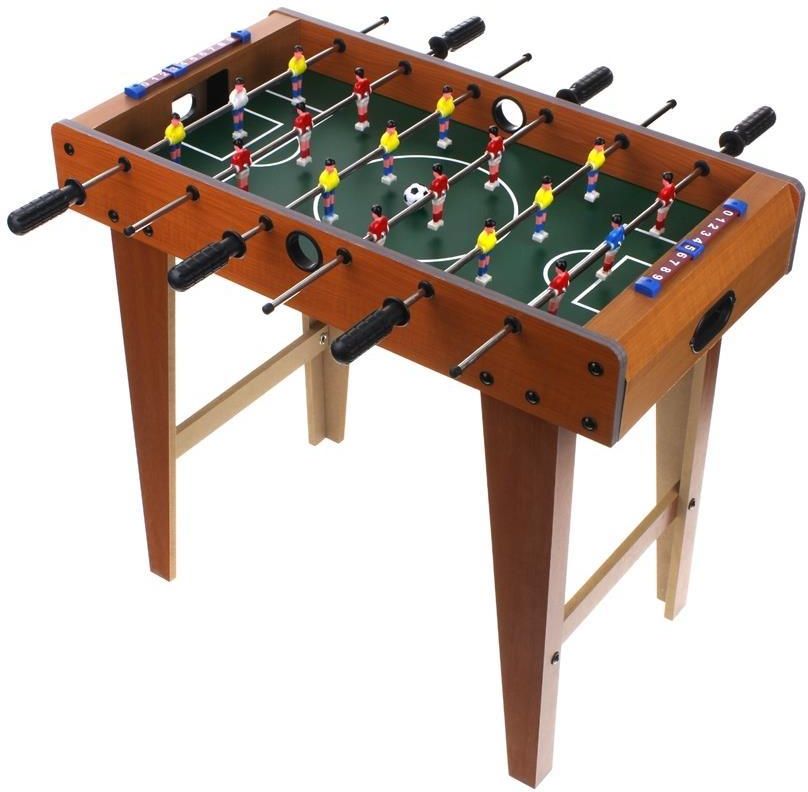 PIŁKARZYKI STOŁOWE STÓŁ DO PIŁKARZYKÓW PIŁKA NOŻNA 18 ZAWODNIKÓW Piłkarzyki to jedna z tych zabawek, które nigdy się nie starzeją i nie wychodzą z mody. Pozwól sobie na chwilę relaksu i świetną zabawę z naszym stołem piłkarskim. Wymiary stołu do piłkarzyków są odpowiednio dostosowane, aby pomieścić dwie drużyny po 9 graczy, zapewniając pełne wrażenia piłkarskie. W SKŁAD ZESTAWU WCHODZI Drewniany stół do gry w piłkarzyki 6 prowadnic z piłkarzykami 2 piłki do gry Elementy montażowe CHARAKTERYSTYKA Skręcana, wytrzymała konstrukcja nóg Prosty montaż i łatwość przenoszenia Plastikowe antypoślizgowe uchwyty Tor punktacji dla obu stron za każdą bramką Zabawka ćwiczy koncentrację, spostrzegawczość, szybkość reakcji CECHY PRODUKTU Sugerowany minimalny wiek (według informacji podanej przez producenta na opakowaniu): 3 lata+ Wymiar rozłożonego stołu: 60 (szer.) x 70 (dł.) x 62 (wys.) cm Długość rączki: ok. 9 cm Odległość prowadnic z piłkarzykami: ok. 10 cm Średnica piłeczki: 2,7 cm Wysokość piłkarzy: 7 cm Wymiary pola do gry: ok. 59 (dł.) x 34 (szer.) cm Wymiary opakowania: 36 (szer.) x 8 (gł.) x 70 (wys.) cm Waga opakowania: 5,368 g nr katalogowy: CH-237400 Informacja od producenta: Nie nadaje się dla dzieci w wieku poniżej 36 miesięcy. Zawiera małe części, które łatwo połknąć lub które mogą się dostać do dróg oddechowych. Niebezpieczeństwo uduszenia.