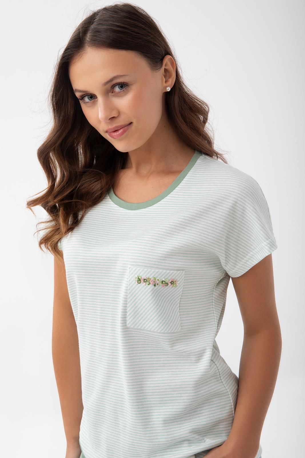 Piżama damska z bawełnianej dzianiny w zielone przecierane paseczki to klasyka, która przypadnie do gustu każdej kobiecie. Piżamka ma wygodny krój. Składa się z bluzki w paseczki oraz swobodnych spodni-bermudów z kieszeniami, o długości przed kolana. Krótkie rękawy oraz okrągły dekolt dodają jej lekkości, a całość prezentuje się wyjątkowo kobieco i przytulnie. Na piersi znajduje się mała kieszonka ozdobiona subtelnym kwiatową aplikacją, która dodaje uroku i odrobinę romantycznego charakteru. Idealna do spania i nieśpiesznego snucia się po domu – zapewnia wygodę i stylowy wygląd. W tej piżamie dobrze się wygląda bez względu na posiadany typ sylwetki. Piżamka sprawdzi się zarówno w domu, jak i na wszelkiego rodzaju wyjazdach. Złożona zajmuje niewiele miejsca, jest przewiewna i naturalna. Skład: 100% bawełna Kolor: zielony PRODUKT POLSKI