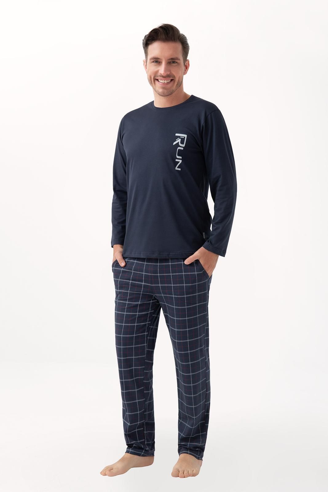 Bawełniana piżama męska marki LUNA składająca się z dzianinowego t-shirtu i spodni w granatowo-grafitową kratę. Granatowa przełamana grafitem bluzka posiada półokrągły dekolt i długie rękawy oraz nadruk "RUN" na boku. Spodnie w kratę mają długie klasyczne nogawki i praktyczne kieszenie. …