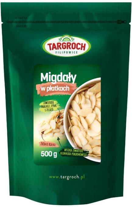 Targroch Płatki migdałowe 1000g Odkryj chrupiącą przyjemność i zdrowotne korzyści z Płatków Migdałowych od Targroch – idealne do zdrowego snackingu i nie tylko! Płatki migdałowe to wszechstronny dodatek do wielu potraw, który łączy w sobie doskonały smak i bogactwo wartości odżywczych. Wyprodukowane z najlepszych, starannie wyselekcjonowanych migdałów, te płatki są nie tylko pyszne, ale także pełne białka, zdrowych tłuszczów i błonnika, co czyni je doskonałym wyborem dla każdego, kto dba o zdrową dietę. Zastosowania Płatków Migdałowych Targroch Idealne jako dodatek do płatków śniadaniowych, musli czy jogurtów, dodając chrupkości i wartości odżywczych. Doskonałe do wypieków, takich jak ciasta, muffiny czy ciasteczka, gdzie dodają delikatnego, migdałowego smaku. Świetnie sprawdzają się w sałatkach i jako dodatek do smoothie, zwiększając ich wartość odżywczą. Mogą być używane jako zdrowa przekąska między posiłkami. Dlaczego warto wybrać Płatki Migdałowe od Targroch 100% naturalne, bez dodatków i konserwantów. Bogate źródło białka i zdrowych tłuszczów. Wysoka zawartość błonnika wspomaga trawienie. Wielofunkcyjność zastosowań w kuchni. Dodaj Płatki Migdałowe od Targroch do swojej diety i ciesz się zdrowiem oraz doskonałym smakiem z każdym kęsem! Płatki migdałowe są doskonałym dodatkiem do wielu diet ze względu na ich korzystny profil odżywczy. Oto kilka diet, do których szczególnie warto je włączyć ? Dieta bezglutenowa - Jako produkt naturalnie bezglutenowy, płatki migdałowe są świetnym wyborem dla osób z celiakią lub nietolerancją glutenu. ? Dieta niskowęglowodanowa - Płatki migdałowe mają stosunkowo niską zawartość węglowodanów, co czyni je idealnymi dla osób na diecie niskowęglowodanowej, w tym diety ketogenicznej. ? Dieta wegańska i wegetariańska - Jako źródło roślinnego białka, płatki migdałowe mogą pomóc w zaspokojeniu zapotrzebowania na białko w dietach roślinnych. ? Dieta paleo - Zgodne z zasadami diety paleo, płatki migdałowe mogą być używane jako zdrowy dodatek do posiłków. ? Dieta na zdrowe serce - Bogate w zdrowe tłuszcze, szczególnie nienasycone kwasy tłuszczowe, które mogą przyczyniać się do poprawy zdrowia serca. Płatki migdałowe są więc uniwersalnym składnikiem, który można łatwo włączyć do różnych diet, dostarczając wartości odżywczych i dodając smaku do wielu potraw. Kraj pochodzenia: USA Składniki: Migdały blanszowane w płatkach Wartość odżywcza produktu w 100 g Wartość energetyczna 2528 kJ / 602 kcal Tłuszcz 50,6 g w tym kwasy tłuszczowe nasycone 3,9 g Węglowodany 9,5 g w tym cukry 5,0 g Błonnik 10,4 g Białko 21,9 g Sól 0,07 g Zawartość soli wynika wyłącznie z obecności naturalnie występującego sodu. RWS – Referencyjne Wartości Spożycia przeciętnej osoby dorosłej (8400kJ/2000kcal). Sposób przechowywania Przechowywać w suchym i chłodnym miejscu, w szczelnie zamkniętym opakowaniu. Informacja alergenna W zakładzie pakowane są również: sezam, migdały, produkty zawierające gluten, różne orzechy. Pomimo dołożenia wszelkich starań nie można w 100% wykluczyć wystąpienia w produkcie tych surowców.