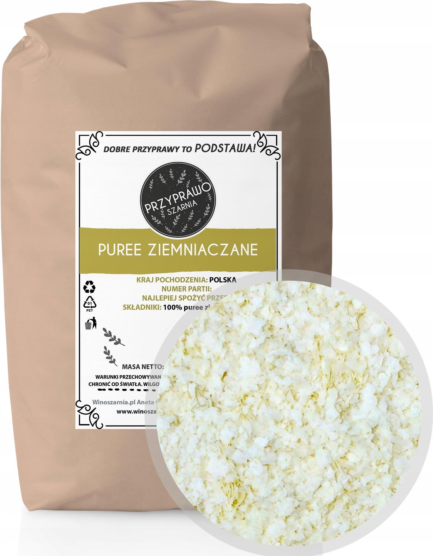 PŁATKI ZIEMNIACZANE 1kg Puree ziemniak 100% Naturalne PŁATKI ZIEMNIACZANE 1kg Puree ziemniak 100% Naturalne PŁATKI ZIEMNIACZANE 1kg Puree ziemniak Płatki ziemniaczane z uwagi na prostotę ich stosowania i przygotowania, obniżenia ubytków podczas obróbki i przechowywania, zmniejszenia kosztów transportu (w stosunku do ziemniaków surowych) oraz możliwości ich wykorzystania w każdym miejscu na kuli ziemskiej, stają się produktem globalnym. Nasze płatki to najwyższej jakości produkt, który od lat uzyskuje pochlebne opinie odbiorców na rynku krajowym i zagranicznym. Jego wysoka jakość jest rezultatem ponad 100-letniego doświadczenia w produkcji wyrobów ziemniaczanych. Parametry Kraj pochodzenia : Polska Składniki: odwodnione ziemniaki (min.99%), emulgator E471, stabilizator E331, substancja konserwująca E222, przeciwutleniacz E320. Opakowanie: saszetka typu doypack z zamknięciem strunowym monoglicerydy destylowanych kwasów tłuszczowych 0 Wartość odżywcza w 100g produktu Wartość energetyczna : 1486 kJ / 355 kcal Tłuszcz: 1,0 g w tym kwasy tłuszczowe: 0,0 g Węglowodany: 80,0g Błonnik: 5,5 g E471 - Glicerydy kwasów tłuszczowych zostały uznane przez światową Organizację Zdrowia (WHO) za bezpieczny dodatek do żywności. Są metabolizowane w organizmie jak wszystkie inne tłuszcze. Ponadto nie są to znane ze swojej szkodliwości kwasy trans, dlatego nie ma powodów do obaw PUREE ZIEMNIACZANE ok. 4 porcje SKŁADNIKI Płatki ziemniaczane 125 g Woda 420 ml (ok. 2 szkl.) Mleko 200 ml (ok. 1 szkl.) Sól 1 łyżeczka SPOSÓB PRZYRZĄDZENIA Dwie szklanki wrzątku, szklanka mleka, łyżeczka soli. Do naczynia z przygotowanym płynem wsypać dwie szklanki płatków ziemniaczanych. NIE MIESZAĆ! NIE GOTOWAĆ! NIE ZALEWAĆ WRZĄTKIEM! Możecie Państwo doprawić puree według własnego uznania i dodać np.: masło, koperek, cebulkę suszoną, zioła prowansalskie lub gałkę muszkatołową. PYZY BŁYSKAWICZNE ok. 5 porcji SKŁADNIKI Ziemniaki surowe 1 kg Płatki ziemniaczane 125 g Mączka ziemniaczana 1 łyżka Sól 1 łyżeczka SPOSÓB PRZYRZĄDZENIA Surowe ziemniaki obrać i zetrzeć na tarce. Wsypać łyżkę mączki i łyżeczkę soli. Mieszając miazgę ziemniaczaną dodawać płatki aż do uzyskania konsystencji pozwalającej na formowanie kulek. Uformowane pyzy gotować 5 min. w osolonej wodzie. Po wyjęciu z wody pyzy polać podsmażonym boczkiem i cebulą. Daj naszym płatkom szansę, a przekonasz się, jak łatwo można urozmaicić swoją kuchnię, sięgając po naturalne i pełnowartościowe składniki! Zapraszamy do zakupu już teraz! PŁATKI ZIEMNIACZANE 1kg Puree ziemniak 100% Naturalne OKAZJA! Sprawdź inne nasze oferty!