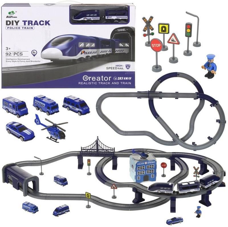Elektryczna kolejka w kolorach policyjnych to idealny zestaw dla małego policjanta fascynującego się pociągami. Ten zestaw pobudzi wyobraźnię i ukształtuję kreatywność każdego dziecka oraz zapewni świetną zabawę z rówieśnikami, rodzeństwem, rodzicami, a nawet samemu. Dzieci podczas zabawy rozwijają orientację przestrzenną, zdolności ruchowe, manualne oraz wyobraźnię. Kolejka z torami i akcesoriami sprawdzi się do emocjonującej i kreatywnej zabawy. Zestaw składa się z wielu ciekawych elementów tj. elektryczna lokomotywa z wagonem, 4 pojazdy policyjne, helikopter czy znaki drogowe. Każdy element będzie dodatkową atrakcją w czasie budowy i zabawy dziecka. Lokomotywa zasilana jest 2 bateriami AAA umieszczonymi wewnątrz lokomotywy. Za pomocą magnesu do lokomotywy można doczepić wagon idealny do przewozu policjantów lub więźniów. Zestaw składa się z 27 odcinków torów oraz z 21 łączników. W jednym z elementów toru znajduję się przycisk z wbudowanymi efektami dźwiękowymi charakterystycznymi dla przejazdu pociągu (tj. syreny ostrzegawcze, dźwięk przejazdu wagonów). Wystarczy, że elektryczna kolejka z napędem przejedzie przycisk w torze i aktywuje moduł dźwiękowy. Zestaw składa się z dwóch wersji: - zestaw z lokomotywą z napędem oraz dwoma wagonami - zestaw z lokomotywą z napędem, wagonem oraz lokomotywą (bez napędu) W skład zestawu wchodzi 92 elementów: - elektryczna lokomotywa - lokomotywa lub wagon - wagon - figurka policjanta - 4 pojazdy policyjne - helikopter - tunel (5 elementów) - posterunek policyjny (5 elementy) - 6 znaków (12 elementów) - most (3 elementów) - podpory (9 elementów) - tor (27 elementów) - łączniki toru (21 elementów) - naklejki na znaki Wymiary: - lokomotywa: 11 (dł.) x 3,5 (szer.) x 5 (wys.) cm - wagon: 8,5 (dł.) x 3,5 (szer.) x 5 (wys.) cm - figurka policjanta: 4,5 (wys.) cm - helikopter: 8 (dł.) cm - pojazd policyjny: 7 (dł.) cm - kolejka po złożeniu: 102 (dł.) x 58 (szer.) cm - powierzchnia kolejki: 5,916 m² Odpowiedni wiek: 3 lata+ Ilość elementów: 92 Zasilanie kolejki: 2 baterie AAA (brak w zestawie) Zasilanie modułu dźwiękowego: 2 baterie AAA (brak w zestawie) Wymiary opakowania: 52 (szer.) x 8 (gł.) x 35 (wys.) cm Informacja od producenta: Nie nadaje się dla dzieci w wieku poniżej 36 miesięcy. Zawiera małe części, które łatwo połknąć lub które mogą się dostać do dróg oddechowych. Niebezpieczeństwo uduszenia.