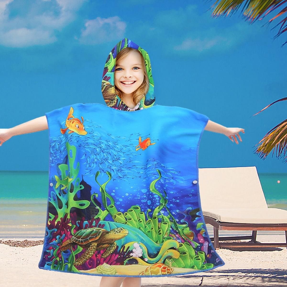 Niebieskie poncho plażowe dziecięce we wzorze oceanicznej ławicy to świetna alternatywa dla standardowego ręcznika. Idealnie sprawdza się po kąpieli czy też podczas pobytu na plaży czy basenie. Miękki i przyjemny w dotyku materiał otuli każde dziecko po wyjściu z wody. Doskonale chłonie wodę i szybko schnie. Poncho posiada kaptur, który ochroni maluszka przed wiatrem czy słońcem. To niezbędne wyposażenie modnego małego plażowicza. Wybór wzorów i kolorów jest tak duży, że na pewno każde dziecko wybierze coś dla siebie. Radość z jego używania gwarantowana. Skład: 100% poliester Gramatura: 240 GSM Kolor: wielokolorowy