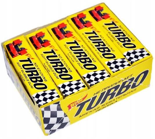 Gumy do żucia Turbo NO STICKING 20 sztuk 400gTurbo Guma Balonowa Turbo 20 sztukMiękkie gumy balonowe, każda guma w osobnym papierku. Zawiera obrazki z samochodami. Waga pojedynczej gumy 22,5 g. Mała paczka mieści 5 sztuk gum wraz z obrazkami. Data ważności: 01/2026Smak i zapach tutti-frutti